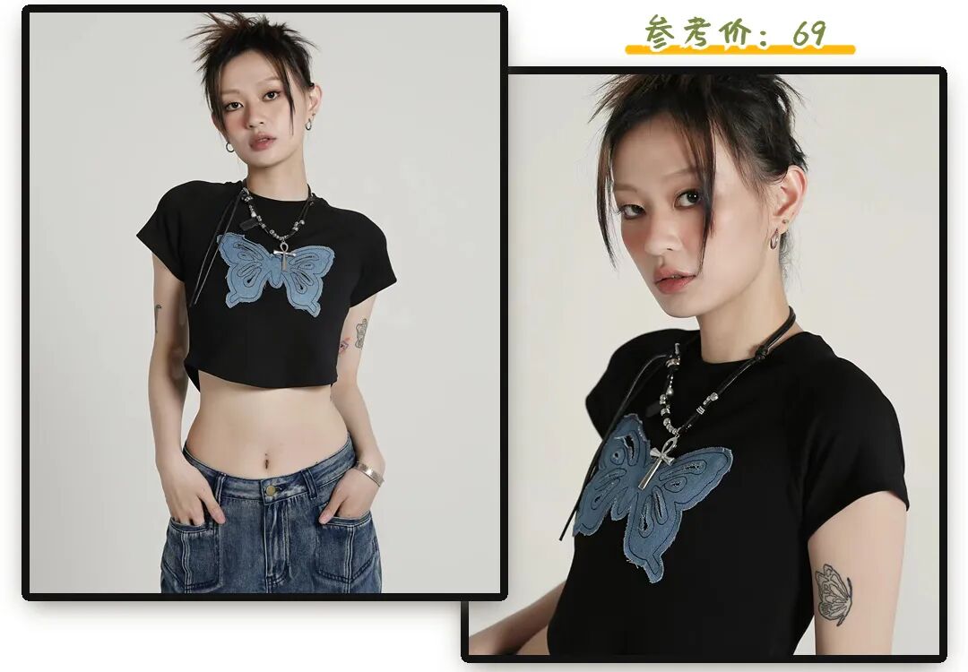 蝴蝶牛仔绣花增加了T恤的精致度,小露腰线又甜又辣~