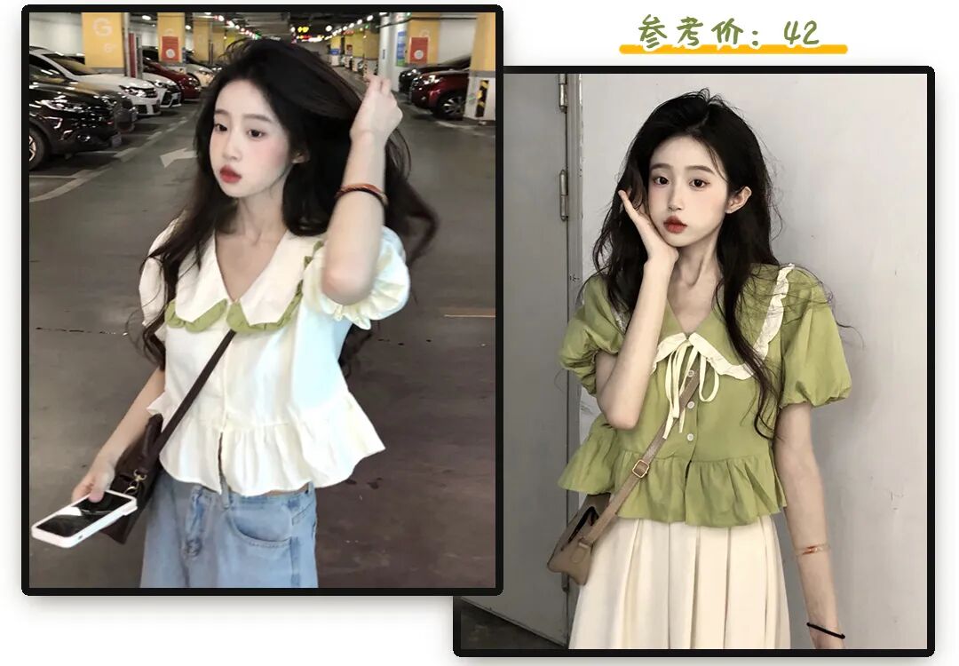 还有娃娃领+泡泡袖双重可爱buff加持,甜妹必备~