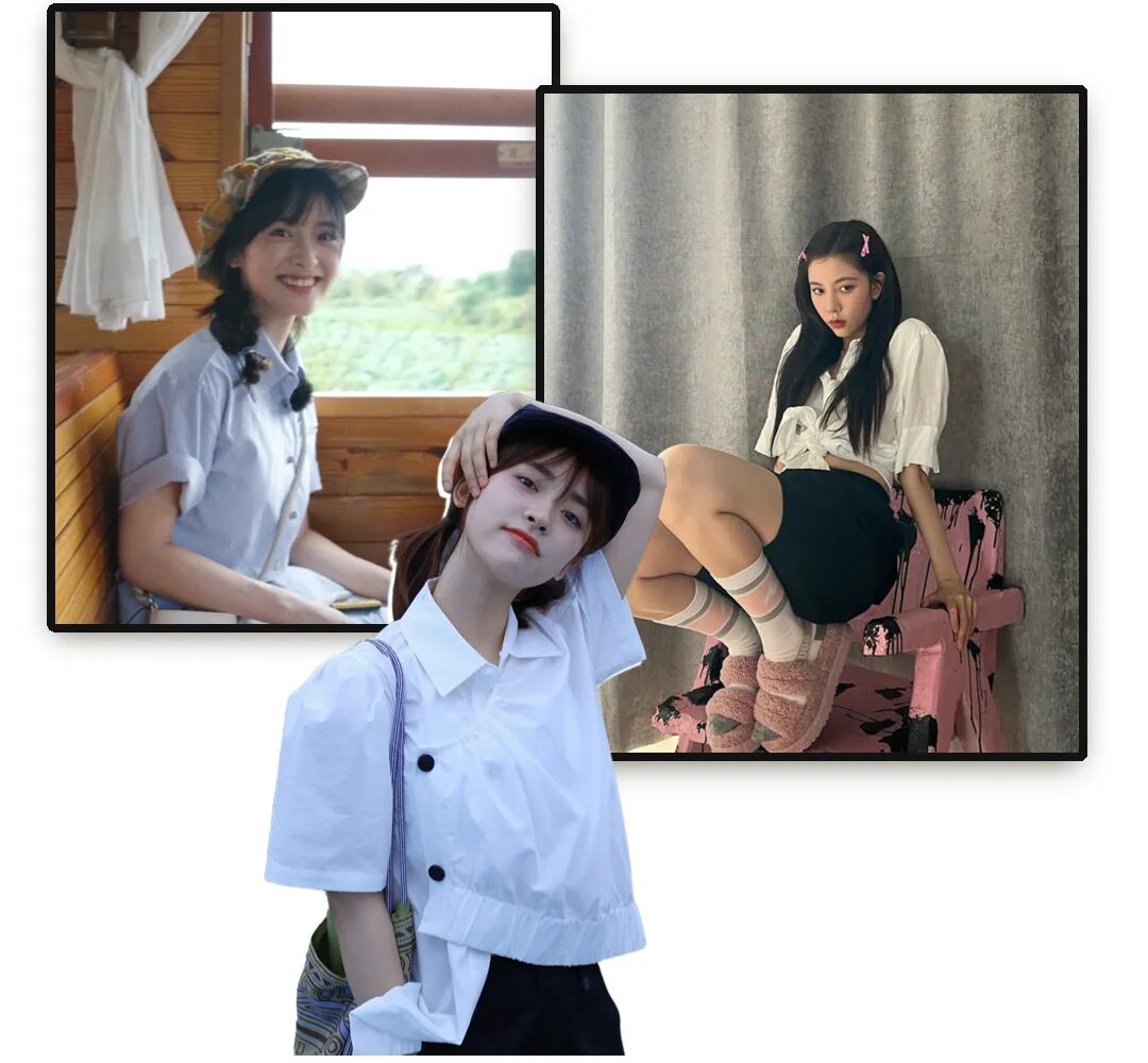 衬衫材质的小上衣绝对算是常青树,可正式可休闲能适配各种风格,属于随便选款都不会出错的类型。