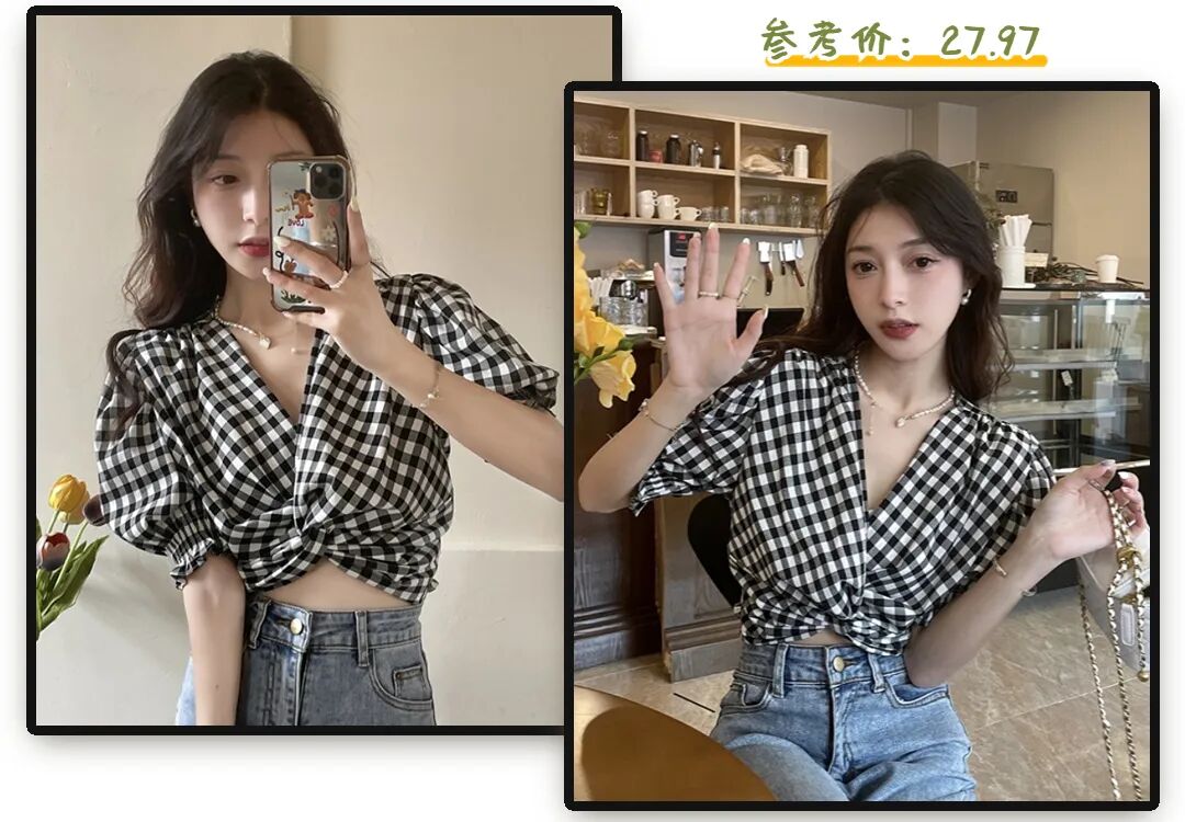 黑白格子短袖衬衫也是运用了前面交叉打结的设计既给穿搭加分也能凸显身材,衬得人温柔文艺~