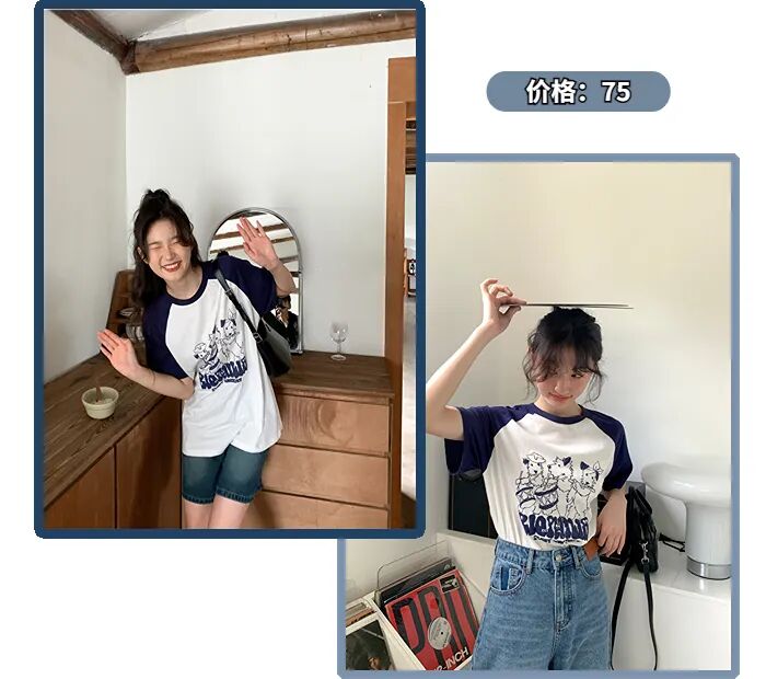 蓝白撞色的插肩T,也是今年的大热元素,不仅休闲,插肩加简笔画元素,自带年轻元气!