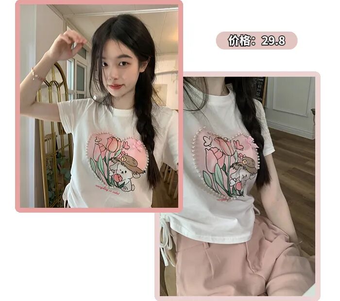 图案轮廓的小珍珠和侧面抽绳设计,让短袖变得细节满满,同时也兼顾了修饰身材拉高比例的优点~
