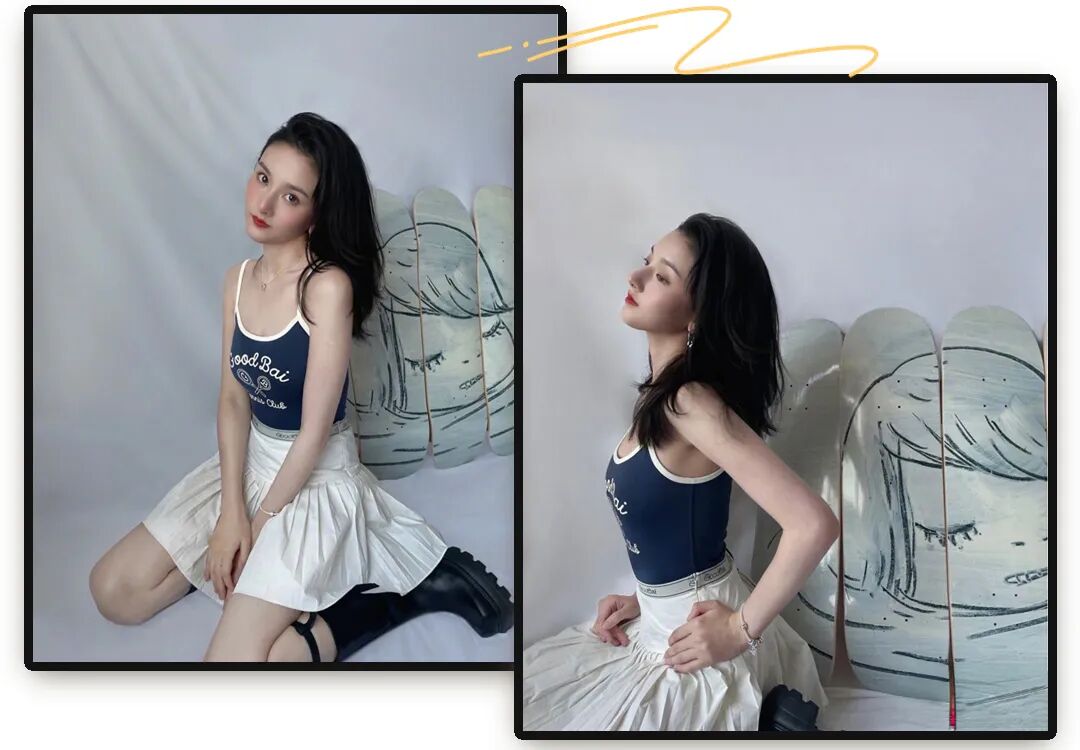 百褶裙+辣妹背心甜辣氛围属实拿捏住了,配上点睛之笔的厚底黑色皮靴真·满分穿搭!