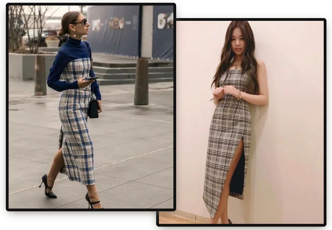 Jennie也是早早就穿上了秋季格纹长裙,略带沉稳的贵气感也就只有粗花呢能做到了!(记得一定要pick收腰款,有效优化身材比例)