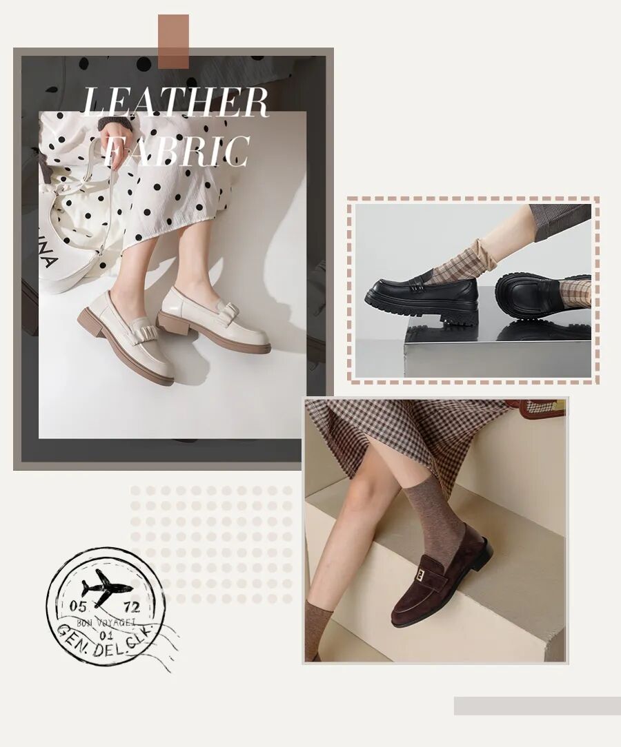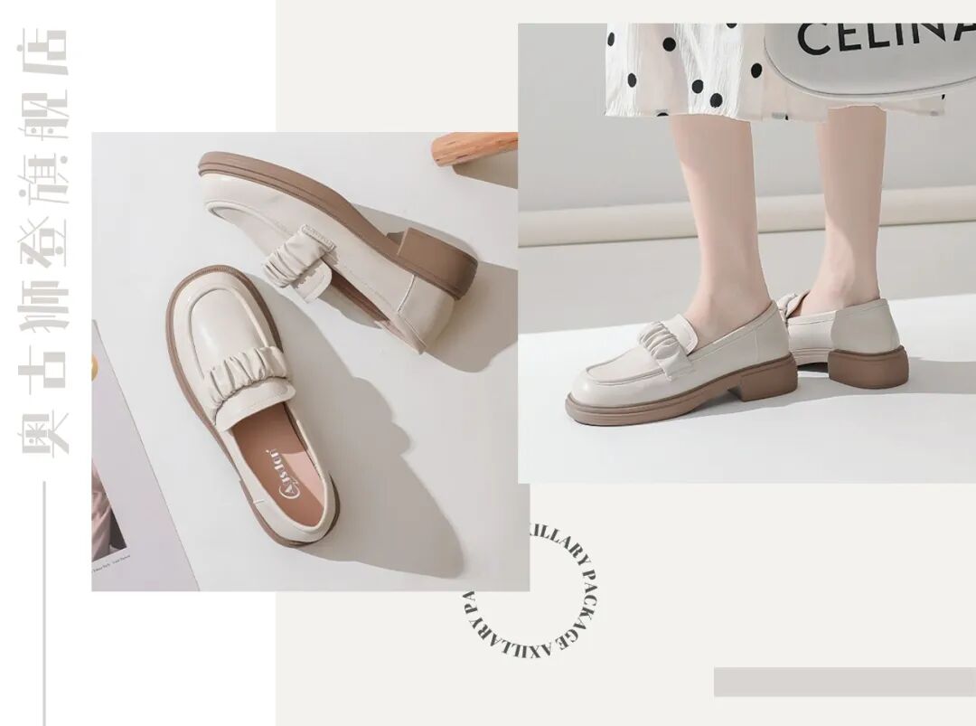 杏色的乐福鞋真的好温柔,简约又百搭。鞋面的褶皱装饰让鞋子不再单调。鞋型秀气小巧,不会显得笨重。方头设计不压脚,胖脚女孩也可以放心冲!