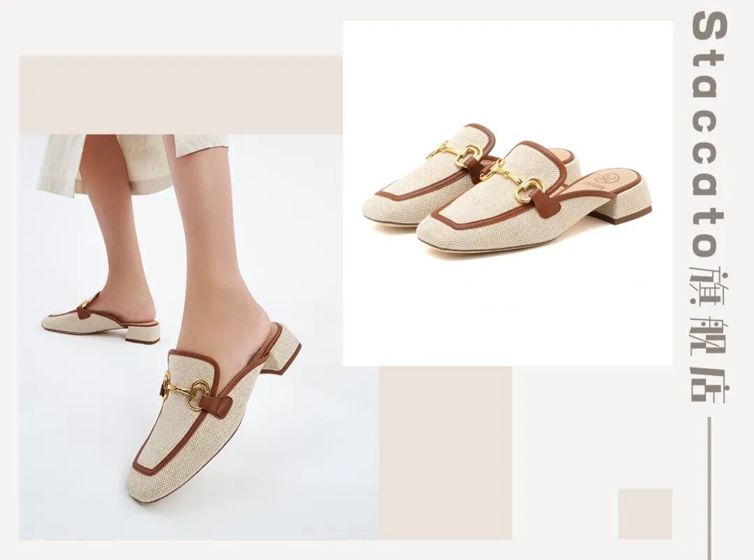 好PICK这款复古拼色穆勒鞋,棉麻的鞋面很独特~ 铜金色回形饰扣让简约的鞋面不再单调,设计经典不过时!鞋跟高度3cm左右刚刚好。