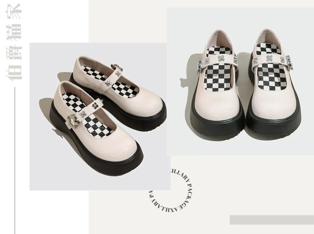 厚底玛丽珍也一定要安排上,显高显腿细,小个子星人最爱!白色亮面漆皮配上小花金属扣,设计感满满,内里棋盘格图案也很细节,甜酷女孩直接冲!