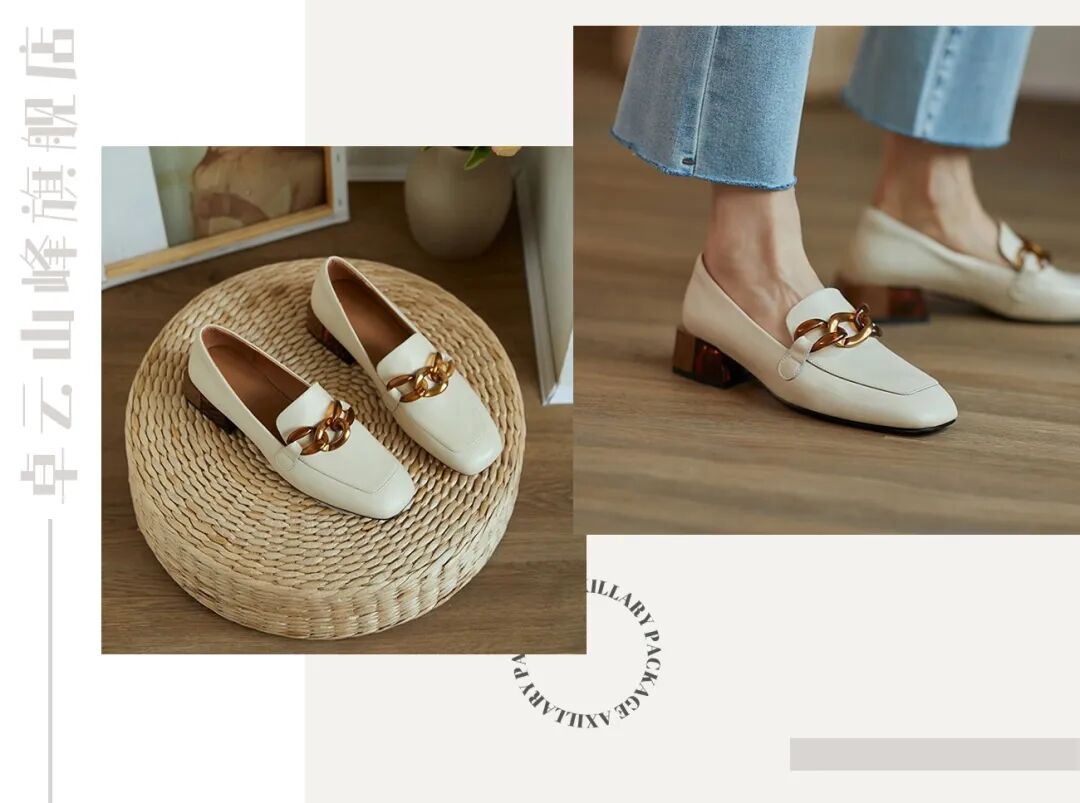 白色乐福鞋温柔知性,琥珀色鞋跟心机满满,链条扣饰让乐福鞋更加有设计感。不管是日常通勤还是正式场合都能完美驾驭。