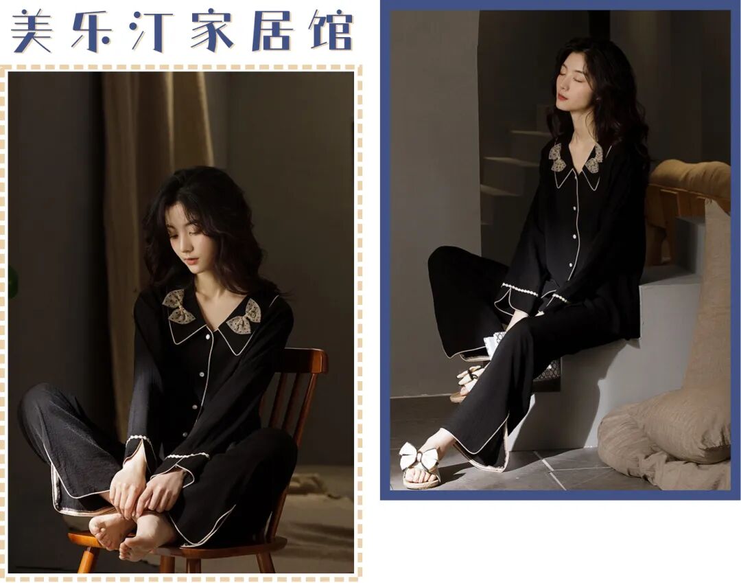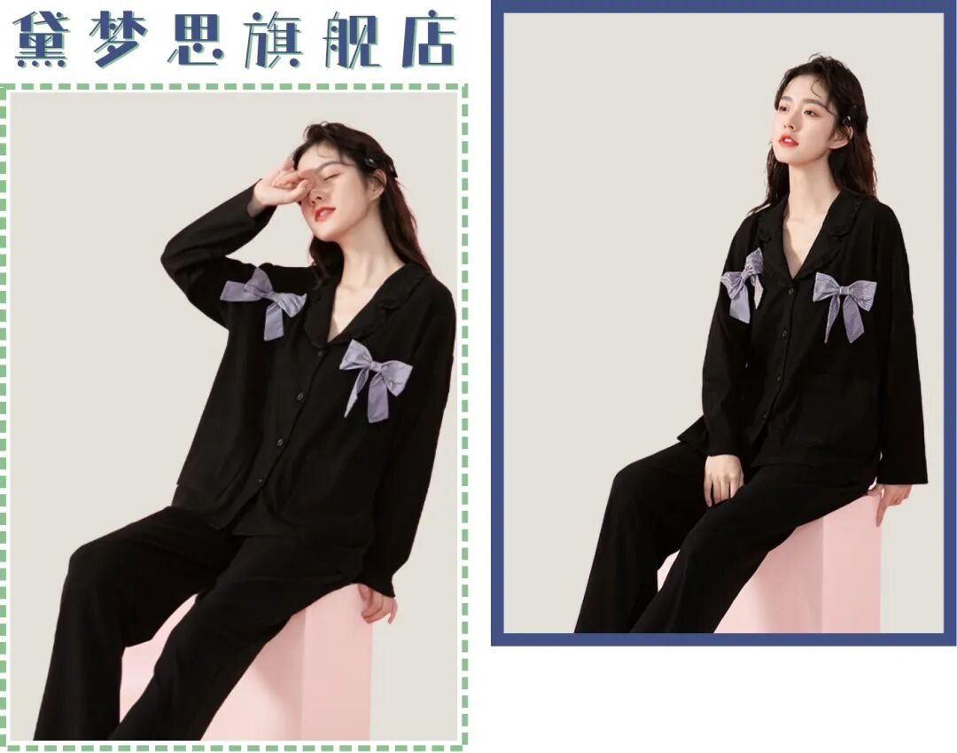 黑色+蝴蝶结,真的把甜酷少女感拿捏得死死的!V领设计很显颈部的线条,不对称蝴蝶结设计让纯黑的家居服没那么单调,好喜欢这种暗戳戳的小心机~