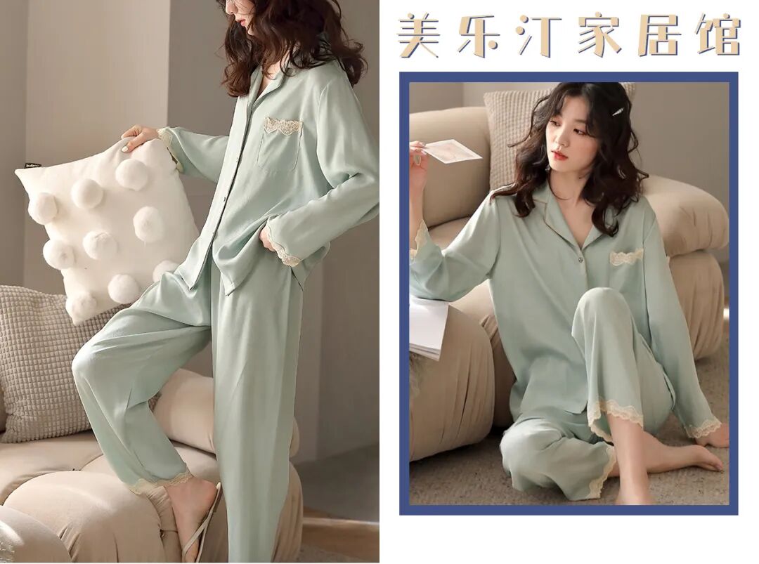 薄荷绿真的是显白王者,穿上它你就是发光的少女!冰丝睡衣手感真的绝绝子~ 款式简约知性,加上白色蕾丝的点缀,自带仙气,纯欲风满满!