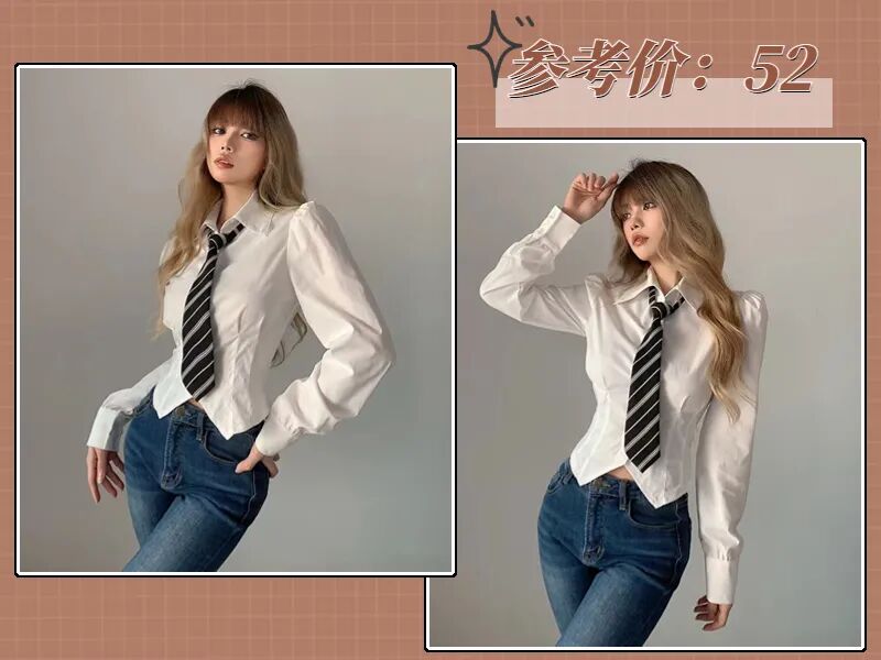 觉得基础款太boring就可以选有设计的款式,比如腰部修身的辣妹款、可爱娃娃领、帅气工装款...什么风格都能找到适配的衬衫款式!
