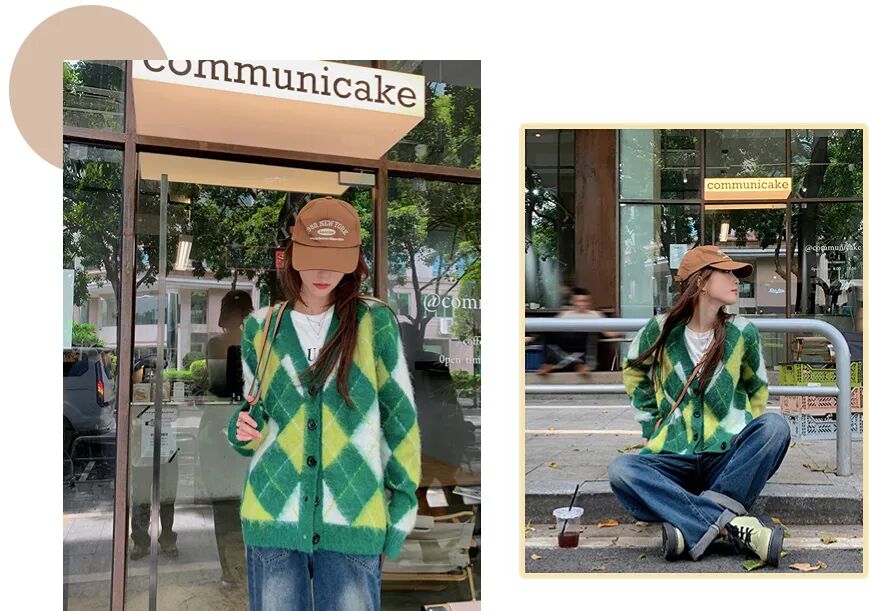 菱格纹是当下很热门的时尚元素,整体随性又自然,绿色的搭配,在秋天也不会觉得沉闷~