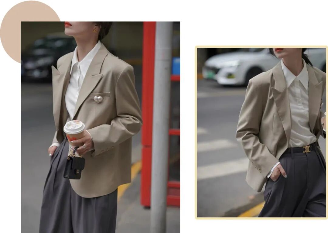 低饱和的色彩搭配,加上正肩短款设计,简单中不失一些精致的细节,超级显瘦显高。