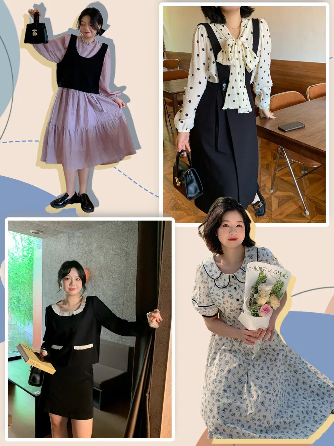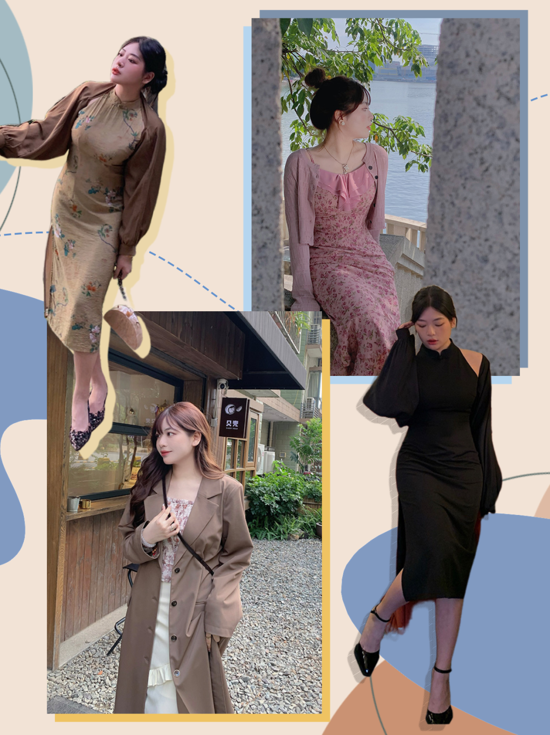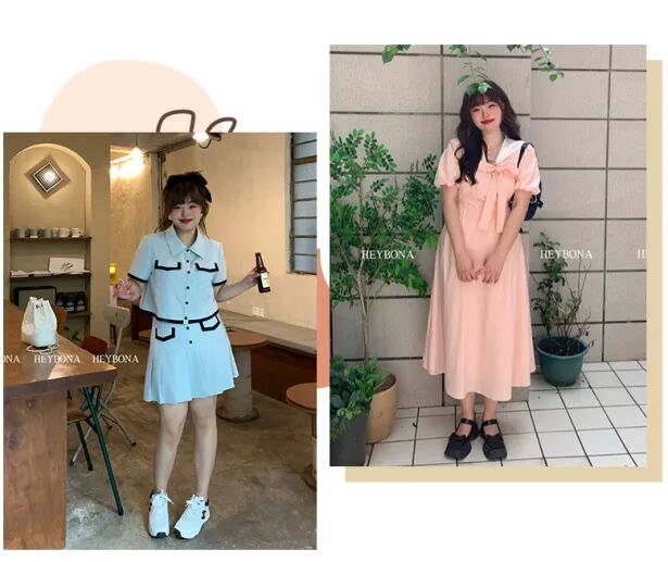 衣服以裙子为主,大多是略微有些宽松的连衣裙,遮肉同时突出腰线。很适合有小肚子但是胸部丰满的姐妹~