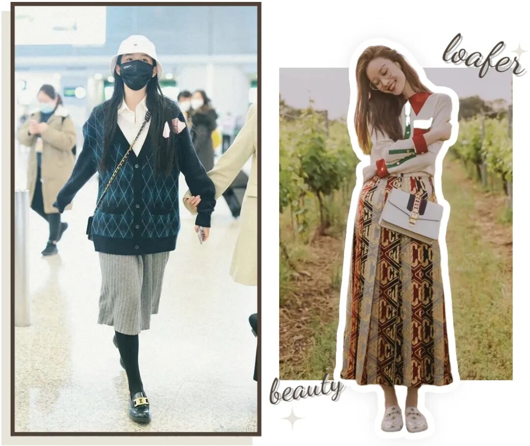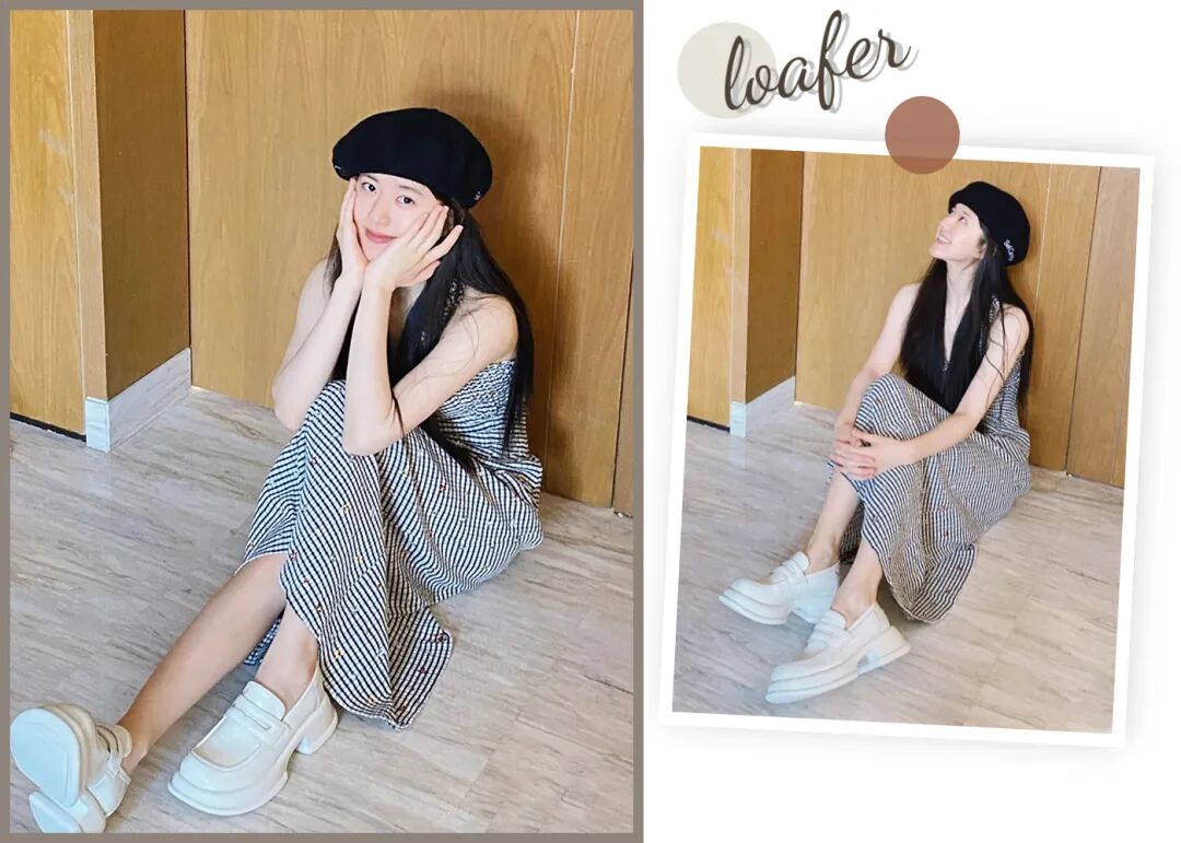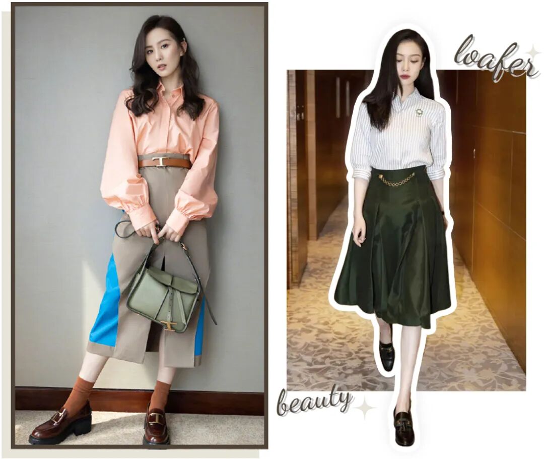 浅色系乐福鞋温柔又减龄,随便搭配一条简单的裙子,就会显得非常优雅~