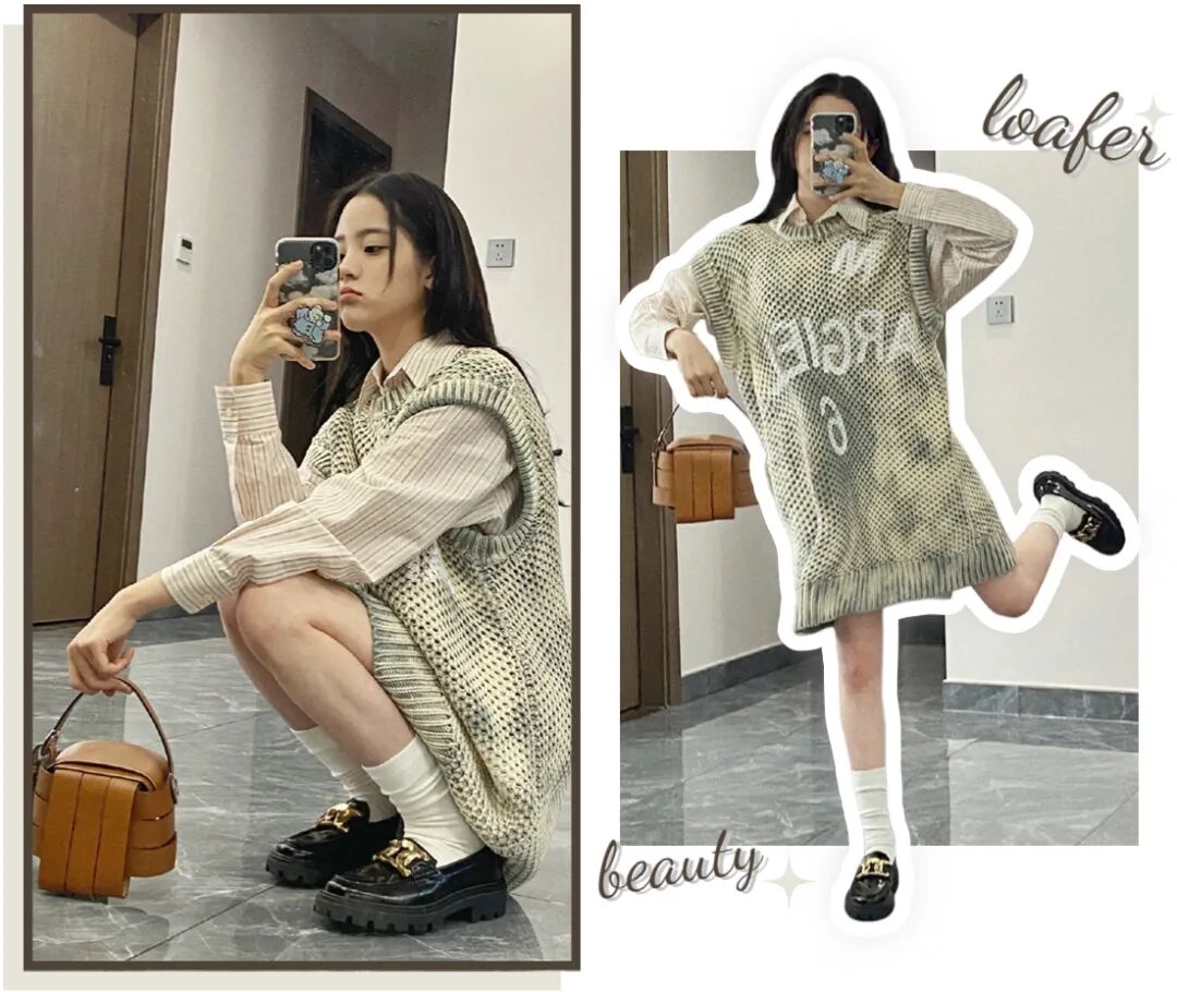白色中筒袜+黑色乐福鞋也是不错的搭配,上衣可以选择叠穿大法,比如oversize的针织背心+条纹衬衫,甜甜的学院风这不就get了?