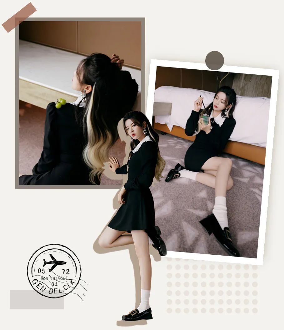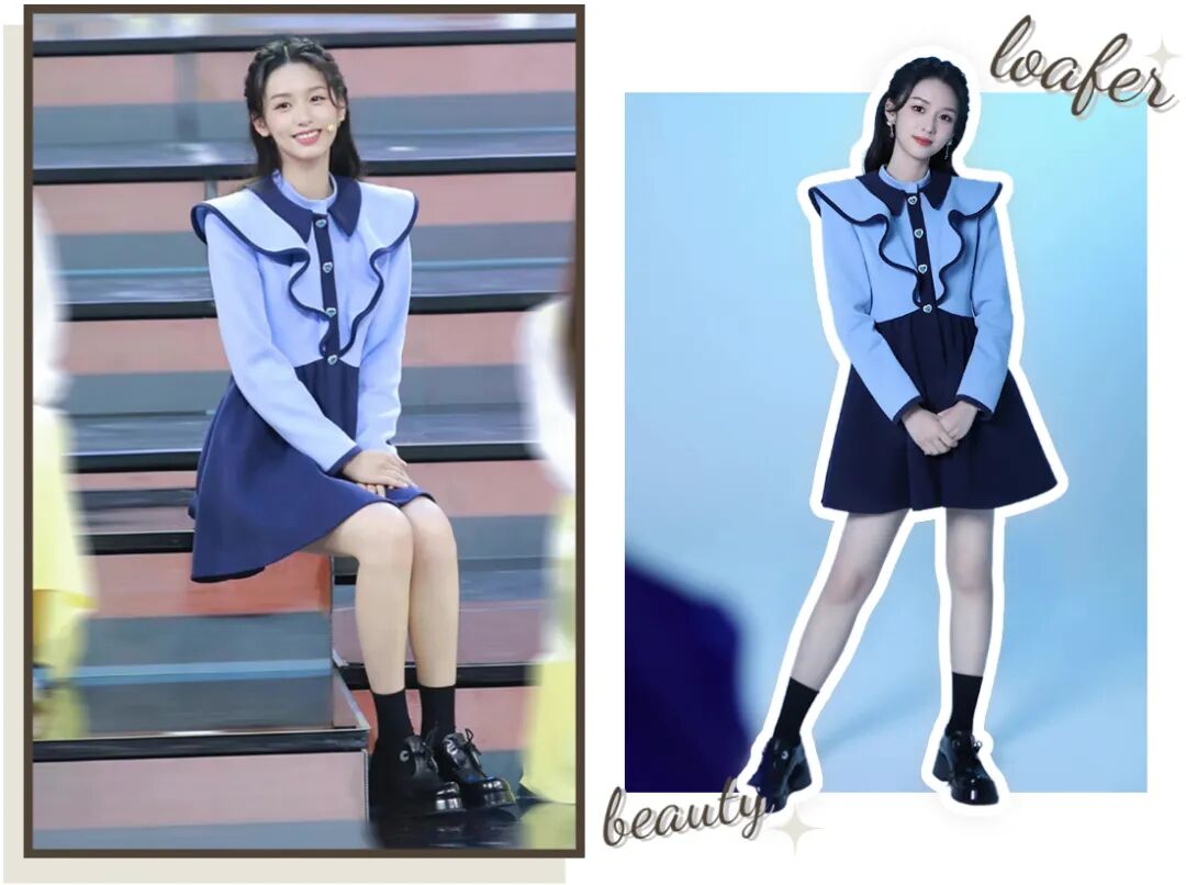 如果觉得白袜子太幼态,那就换成稳重的黑袜子,下半身色调统一的时候,上衣就可以花点小心思,比如增加荷叶边或者娃娃领元素,可爱又减龄。