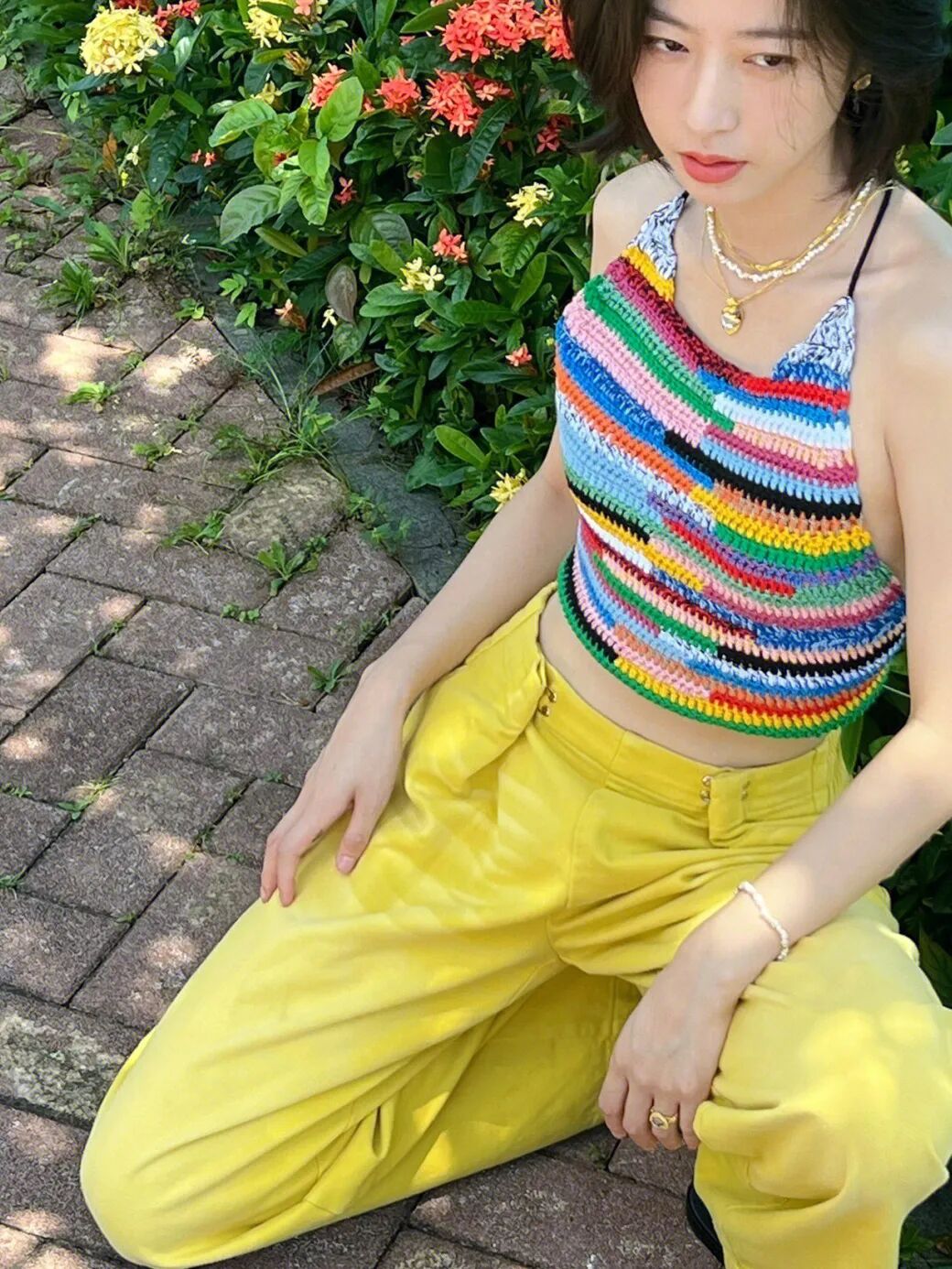 像周姐这样选一件硬挺黄色牛仔裤来match彩色条纹真滴很绝,色彩平衡的刚刚好,即使元素过多也丝毫不显花哨👍