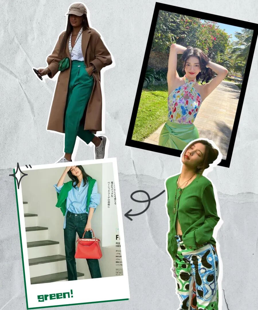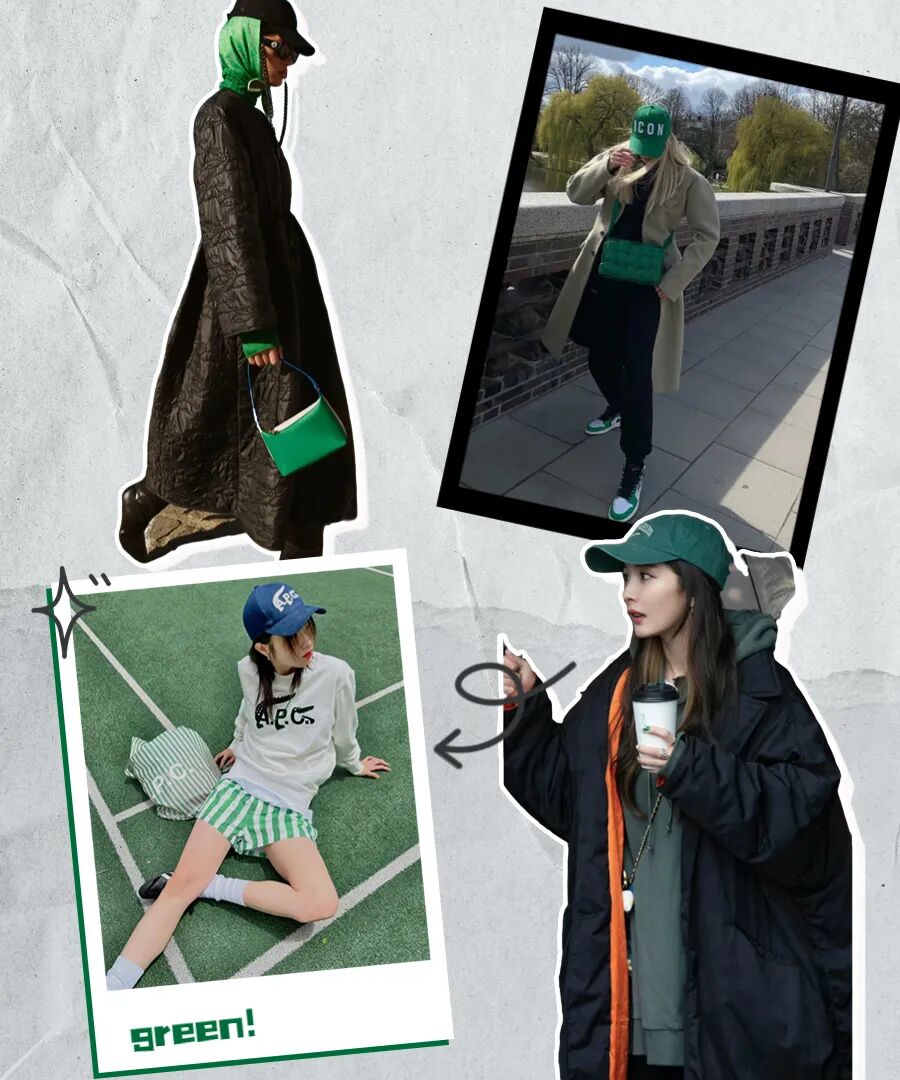 如果实在觉得大面积的绿穿在身上过于显眼,做配饰点缀也是非常不错的idea,围巾、包包、帽子...只要稍加点缀就能给穿搭加分超多。