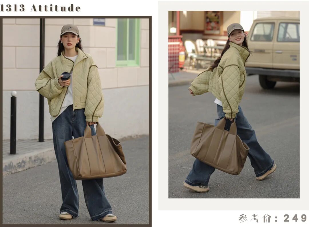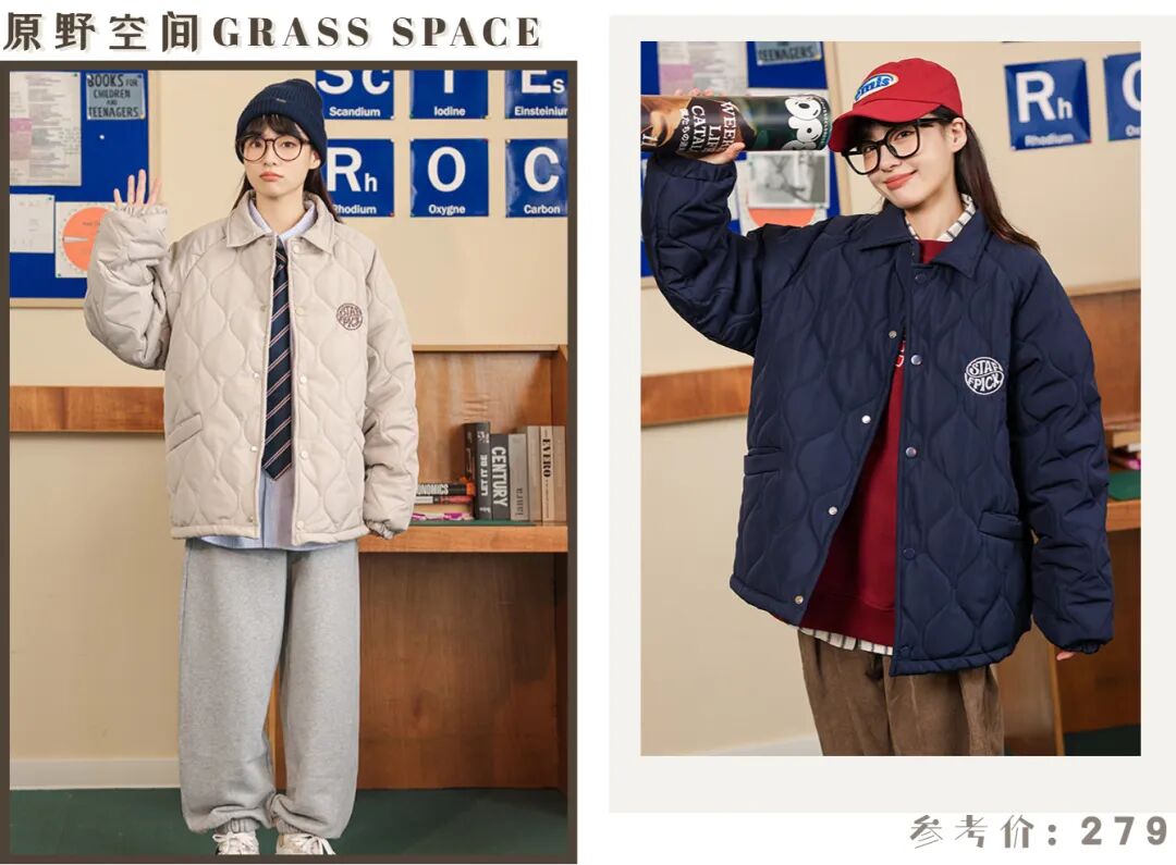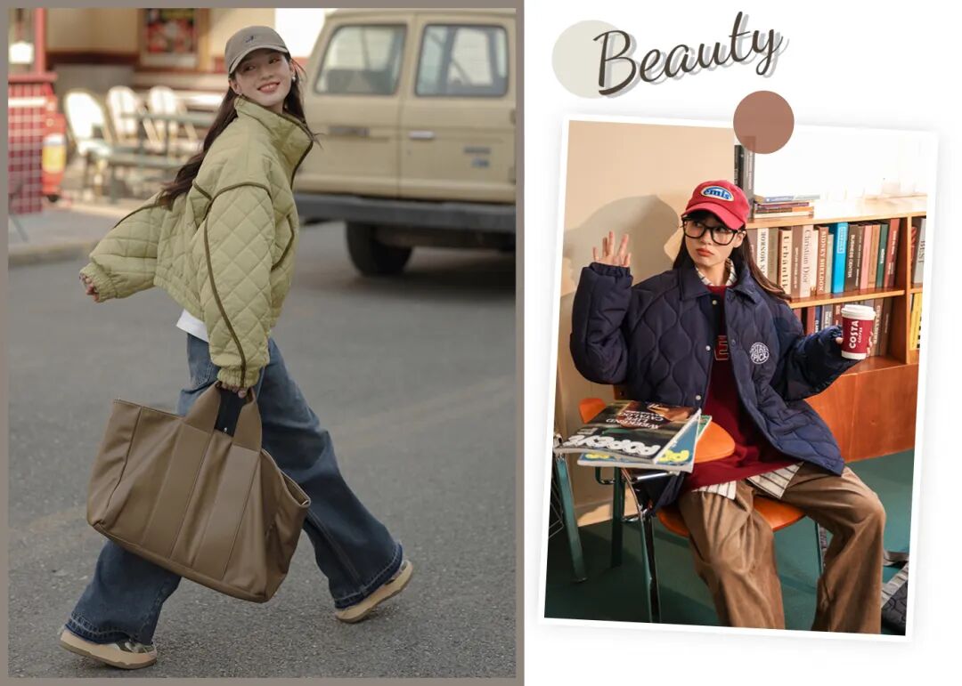 这种阔型的棉服,就比较有休闲的感觉,随性又自在,百搭不挑人,随便搭条裤子就很好看!