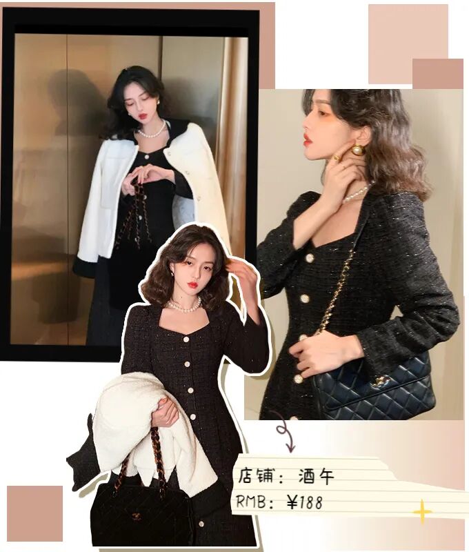 面料带着闪的粗花呢连衣裙当然是名媛必备,match一件黑色大衣气场十足~
