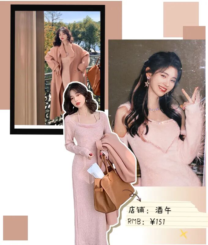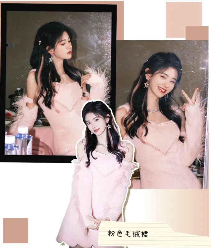 pink和毛绒裙装搭配起来更有1+1>2的效果,甜美不失温柔~