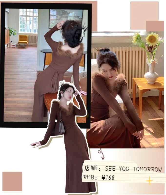 V领收腰设计就更有女人味一些,加上一圈毛毛增添了可爱甜美气息,可以学习模特match一件毛绒绒厚外套👇