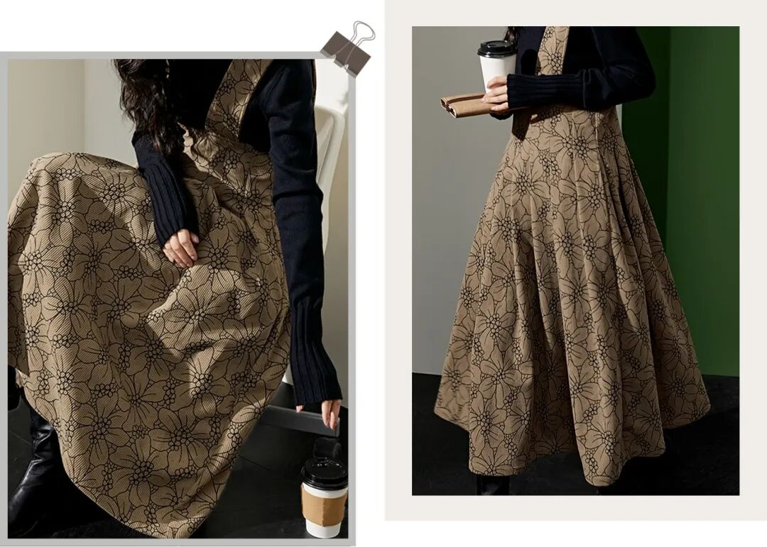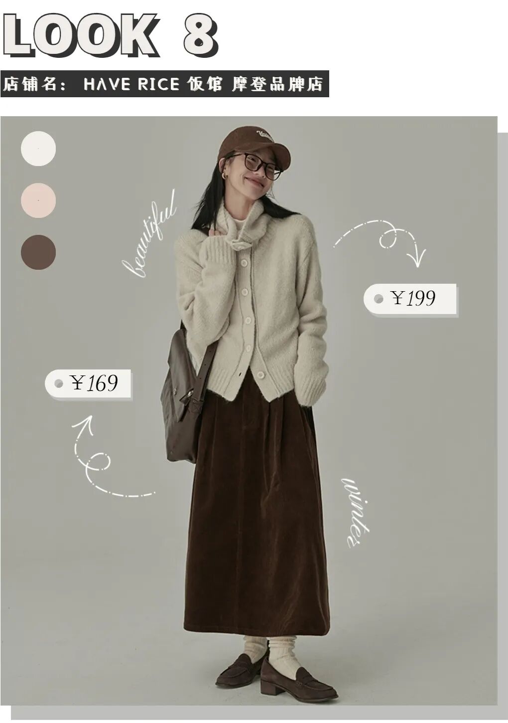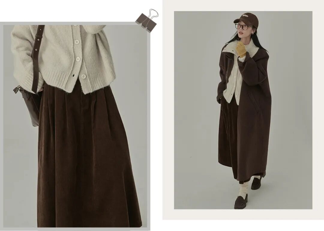 下面搭配了一条超级复古的灯芯绒半裙,大A摆伞裙的版型显瘦显高,秋冬氛围感瞬间拿捏!