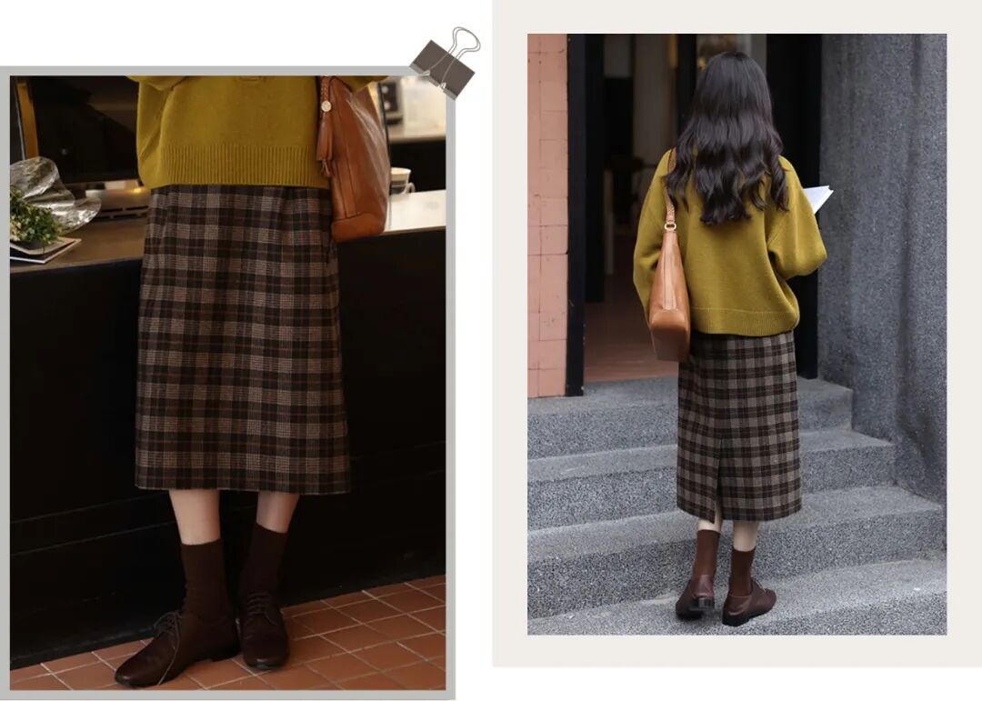 下装是一件非常经典的格纹半身裙,自带绒感的面料很适合秋冬,直筒阔型非常显瘦,深咖底色和米色、桔色的条纹组合在一起,复古氛围感一整个拉满!