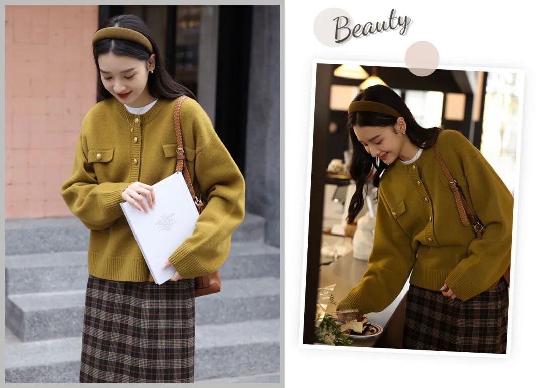 绝美look怎么能少得了小香风呢?焦黄色毛衣+格纹半身裙的组合,气质又优雅,金色纽扣精致耐看,很有vintage的感觉~