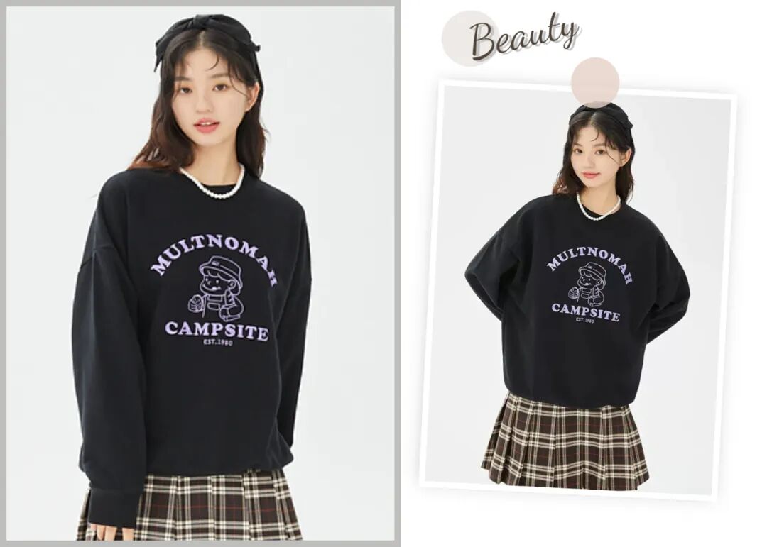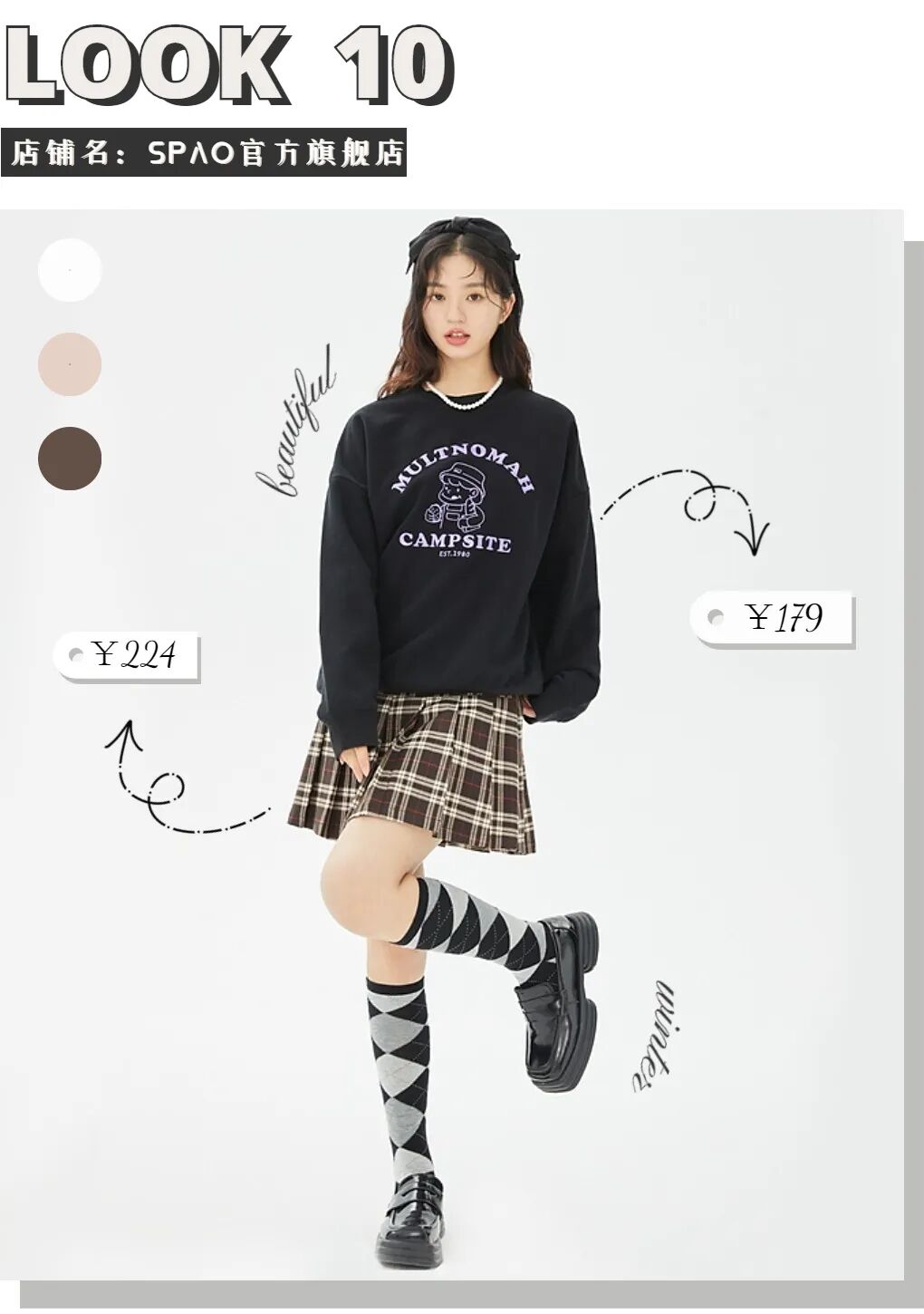 最后一套look是典型的学院风穿搭,百搭又减龄。上衣是一件黑色的圆领卫衣,显瘦又遮肉,胸前的紫色印花很特别,甜酷感十足!