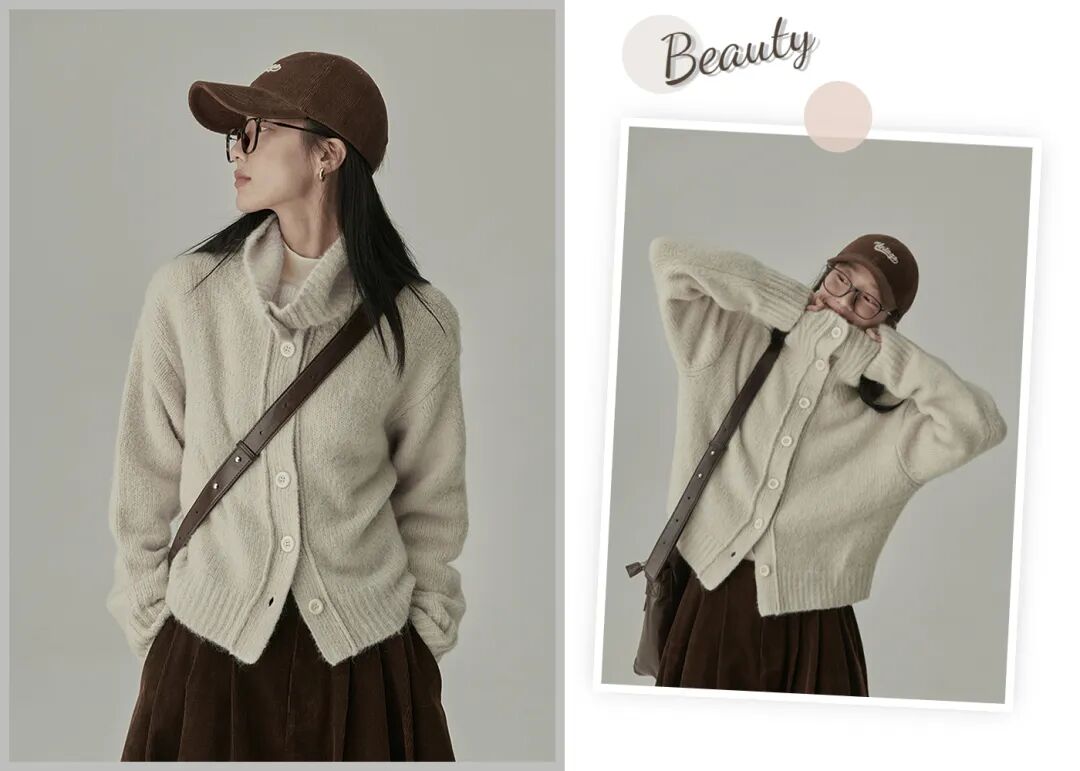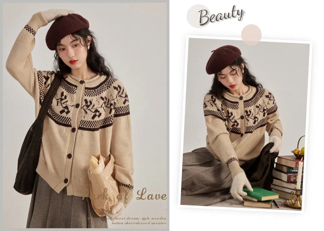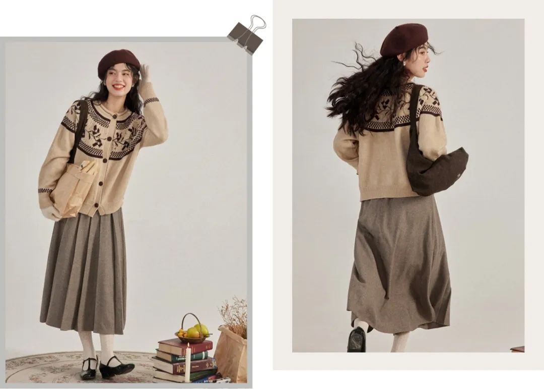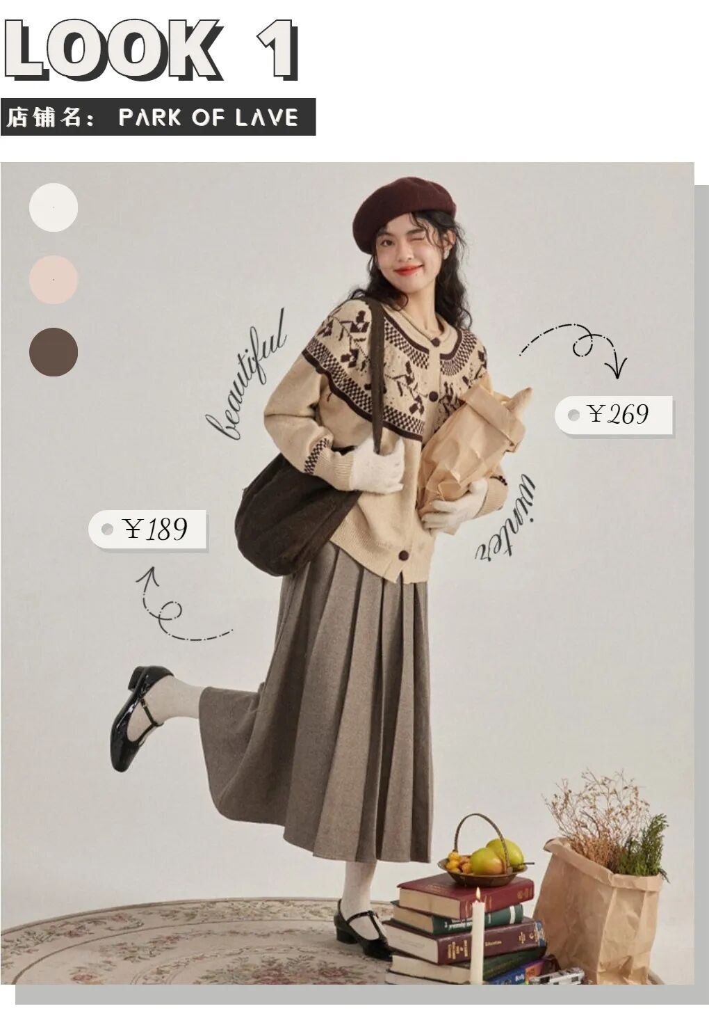 第一套look自带暖意,很有秋冬的氛围感。上衣是一件米咖色针织开衫,小圆领设计经典百搭,衣服上的花纹也很精致~