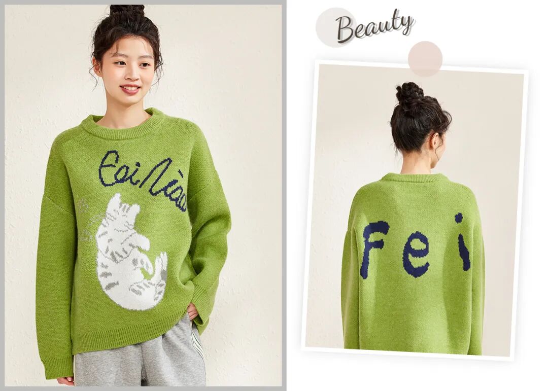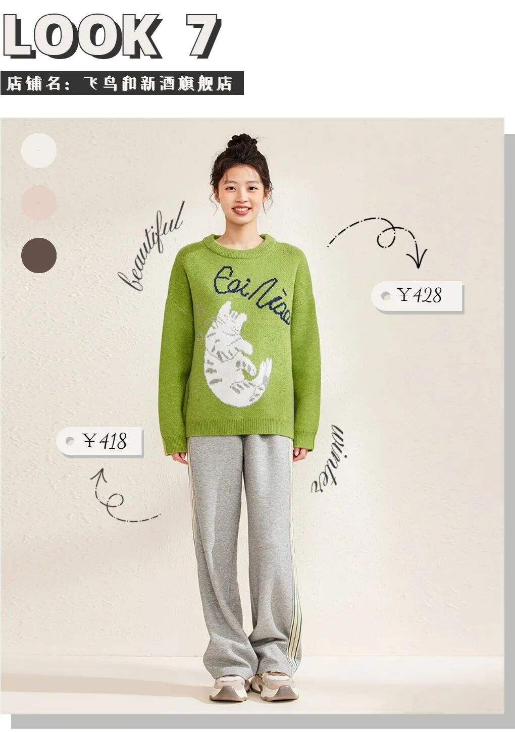 第七套look比较休闲,居家又舒适,完全没有办法抗拒!草绿色针织衫非常吸睛,胸前撞色的阿喵图案也很可爱,趣味十足!
