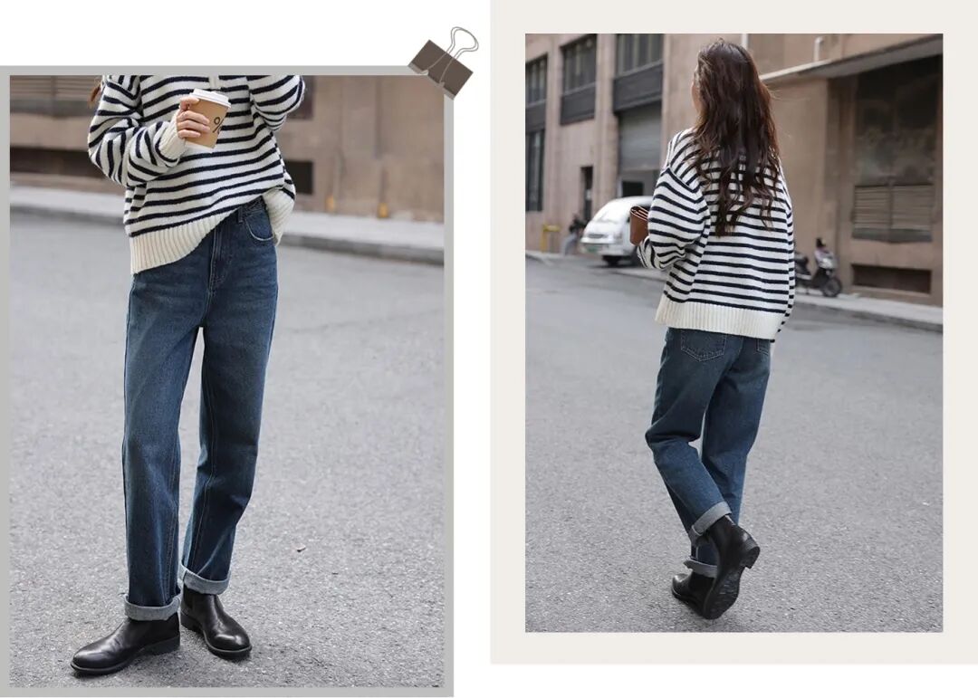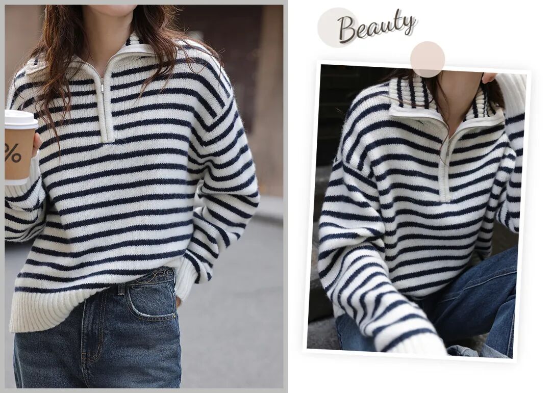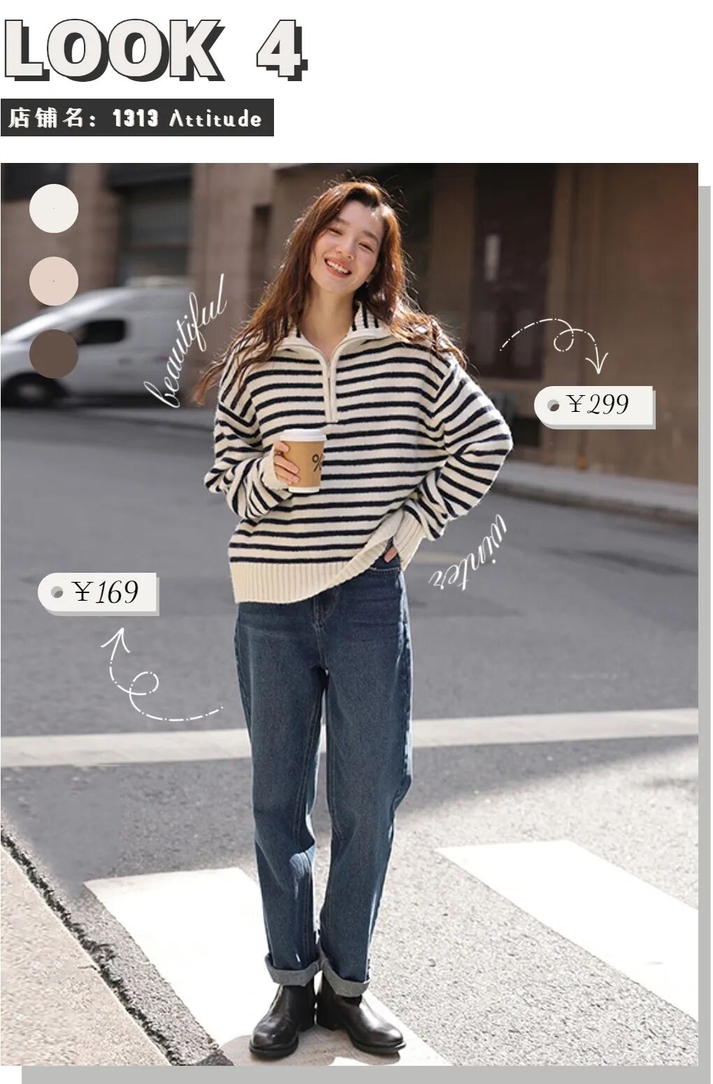 第四套look就是最基础的日常通勤风,简约低调、实穿性非常高!蓝白撞色的条纹毛衣,让人眼前一亮,领口的拉链设计简洁大方,可立可翻,实穿性非常高~