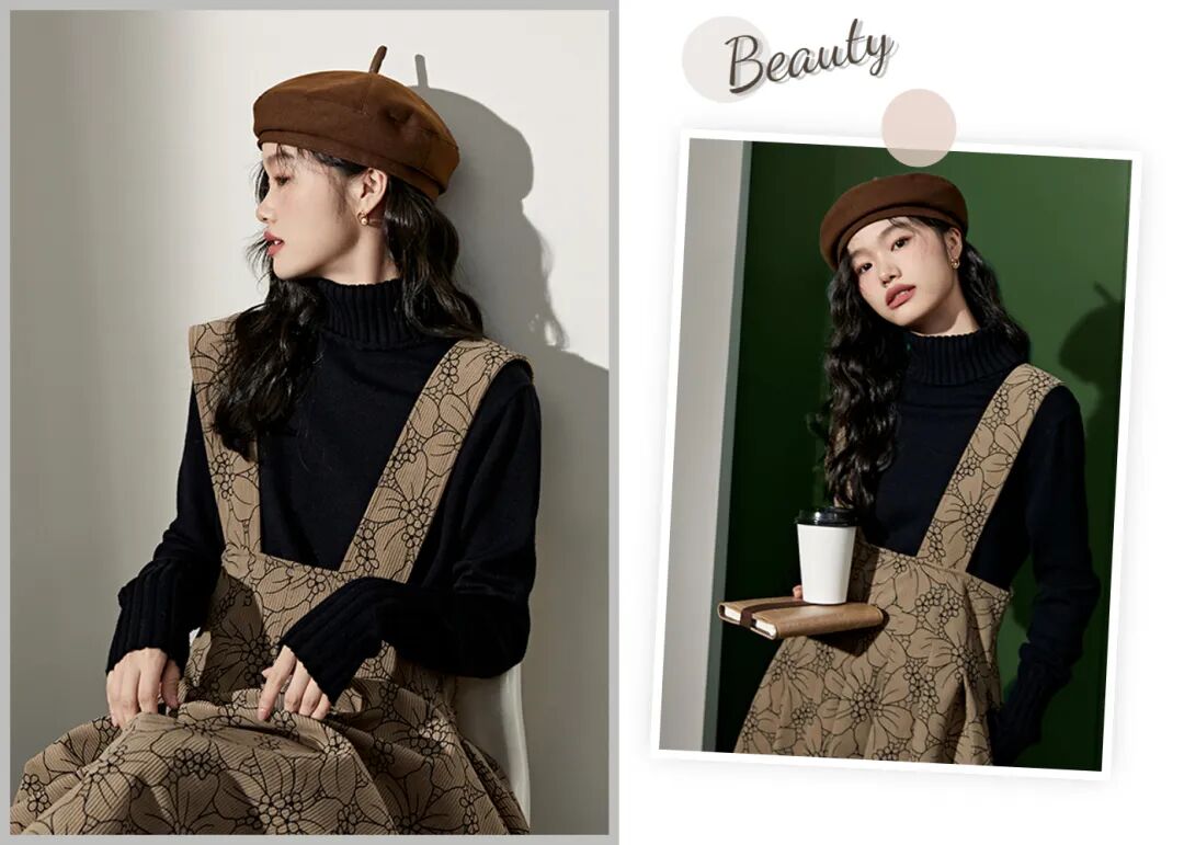 毛衣的外面叠加了一件背带连衣裙。满幅的撞色印花精致细腻,高级感十足,A字阔型的裙摆大气利落,复古又百搭,尽显优雅的气质~