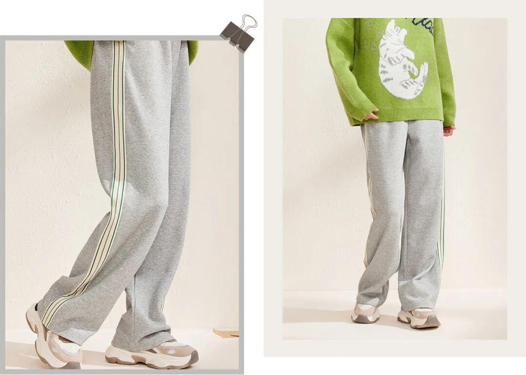 下装是一条低调的灰色休闲裤,宽松的直筒裤型,藏肉又显瘦,侧边的撞色条纹和上衣完美呼应,分分钟get休闲的时髦感~