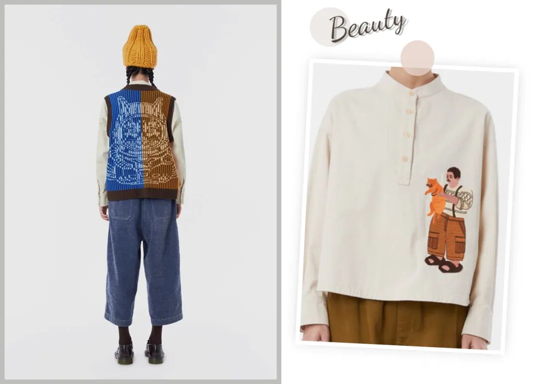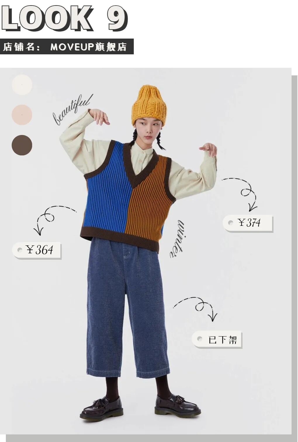 我超爱第九套look的配色,可爱又童趣。上衣是衬衫+背心的组合,衬衫左下角的绣花图案,设计感十足,单穿、内搭都好看!背心的蓝棕配色也很绝,非常复古~