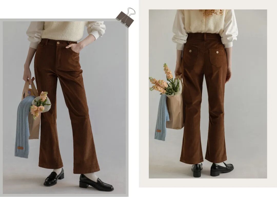 下装是一条棕色的喇叭裤,高腰设计显高显瘦,灯芯绒材质很有秋冬的感觉,耐磨又柔软,复古的氛围感一整个拉满!