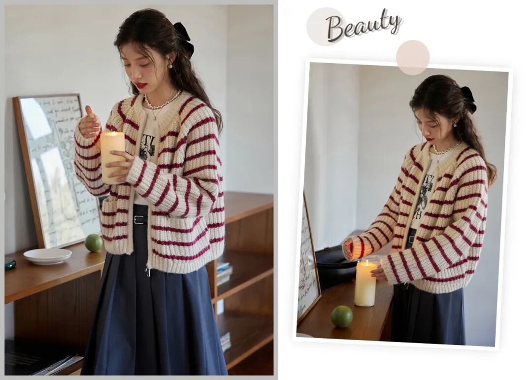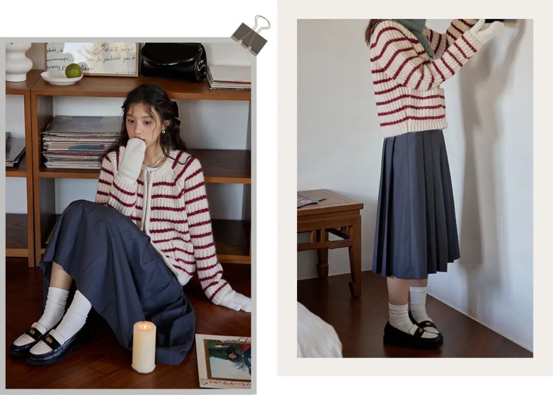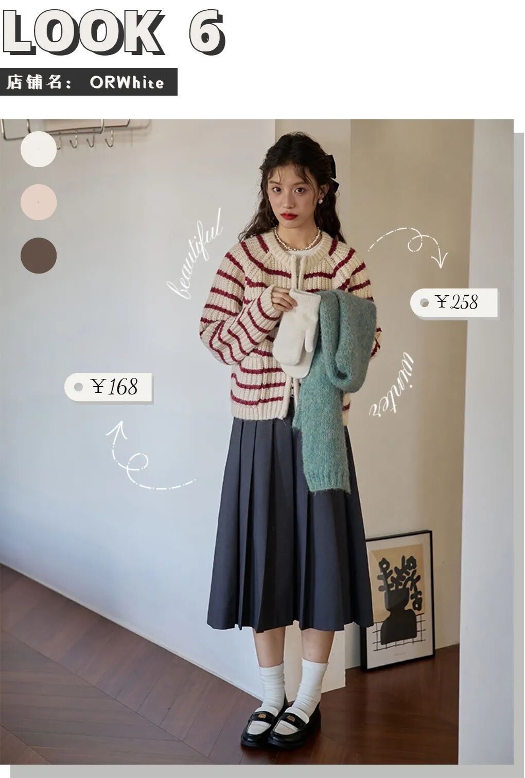 第六套look是毛衣开衫+半身裙的组合,气质又耐看。粗棒针毛衣的层次会更强一点、比较立体,门襟的双头拉链设计非常nice,红白条纹配色也很出彩~
