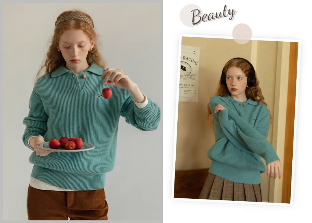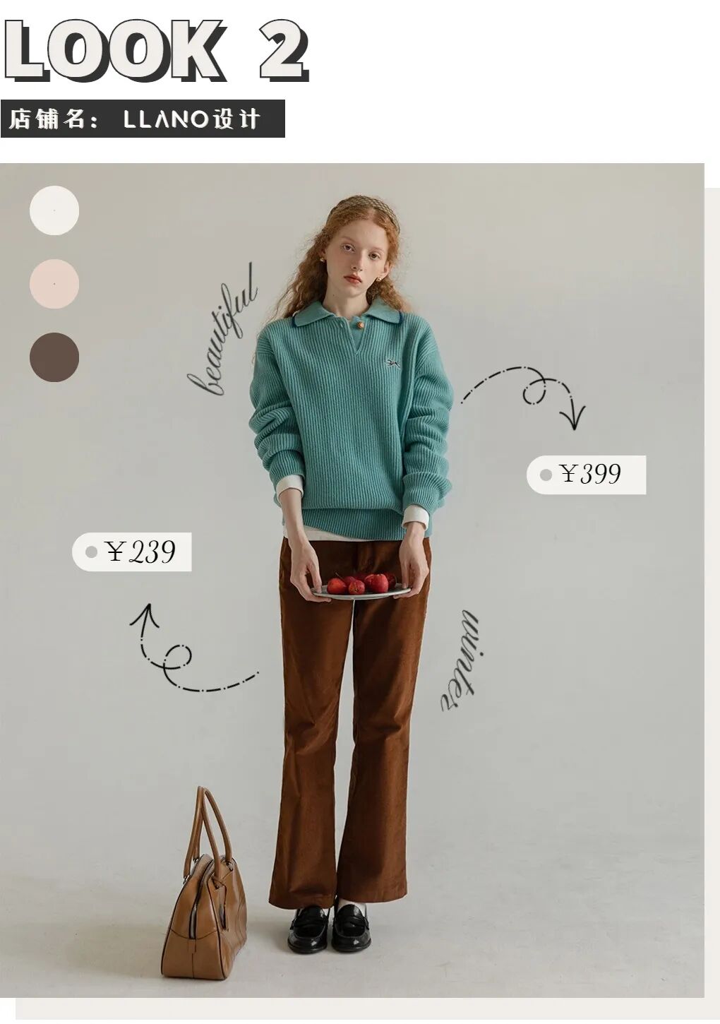 第二套look的配色也太美丽了,谁看了不说一句绝呢?薄荷松石绿的毛衣,复古又显白,前胸的狗狗标识超级可爱,翻领上的棕色小圆扣也非常特别~