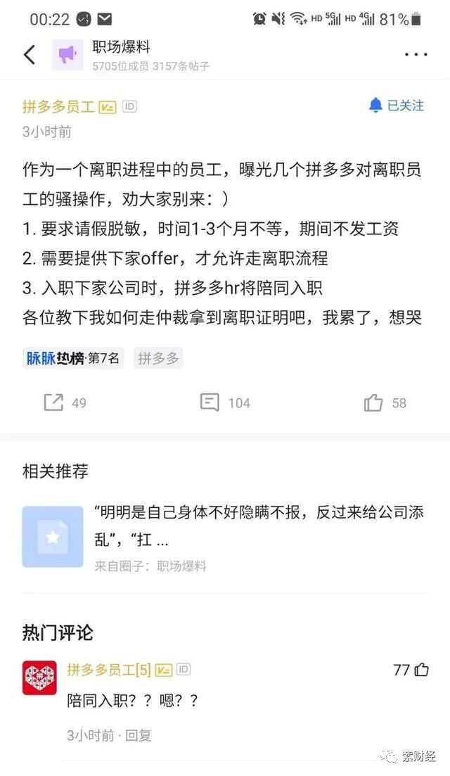 近日,前阿里集团安全研究实验室总监云舒就发微博称,原拼多多安全团队老大在5年服务即将到期可以拿取股票时突然被开除,不得不通过打官司维权。而另一位普通的拼多多员工亦自曝离职障碍重重,难以脱“坑”。