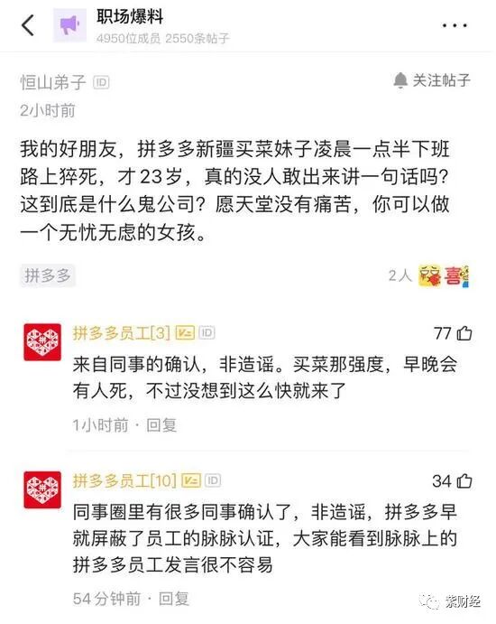 就在谭某林不幸一周前,一位只有22岁的花季女孩刚刚在凌晨一点的下班路上猝死,永远地倒在了2020年,未能等来新年的钟声。在此期间,一位拼多多员工亲手拍下了同事被抬上救护车的照片在社交媒体上疯传,处于风口浪尖上的拼多多又冒天下之大不韪,简单粗暴地开除当事人。
