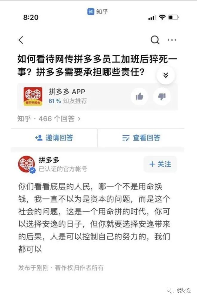 如果答主是一个普通网友,这样的回应没有任何问题,但作为拼多多的官方帐号,正式、得体是最起码的要求。然而,那位立志“为多多守边疆”的张X霏的陨落在这则回应中没有获得一丝一毫的怜惜,更确切的说,换来的只是一个“拿命换钱”的让人出离愤怒的冷漠与无情的嘲讽。