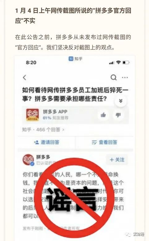 除了介绍早已披露的内容,拼多多的重点其实是否认自己作过任何回应,并将爆料人此前发布的知乎帐号截图断然定义为谣言。