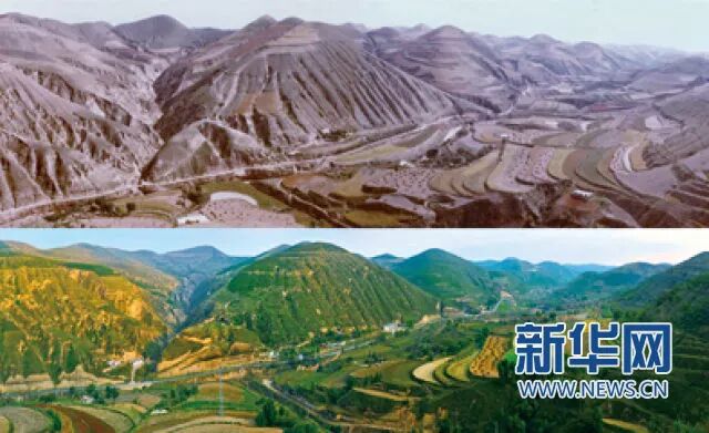 退耕还林20载,“黄土地”刷出“新颜值”。延安市吴起县铁边城镇上营盘山退耕前(上图)与退耕后(下图)对比(资料照片)。