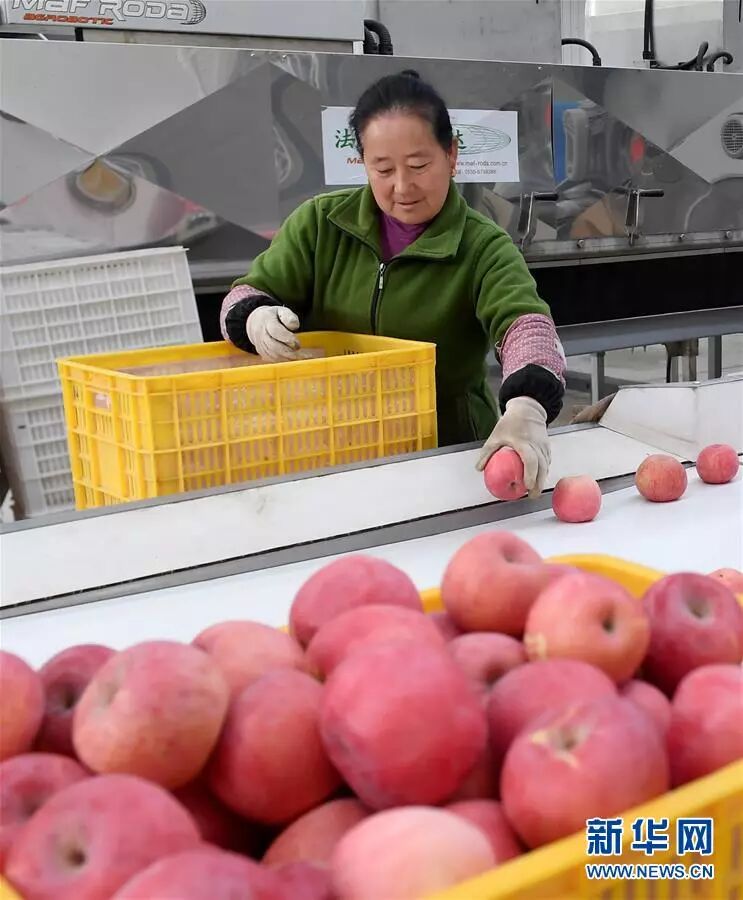 在陕西延安宝塔区一果业公司车间内,工作人员把苹果放上分选线。新华社记者 刘潇 摄