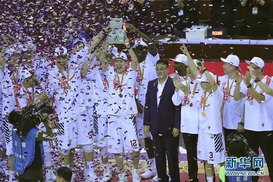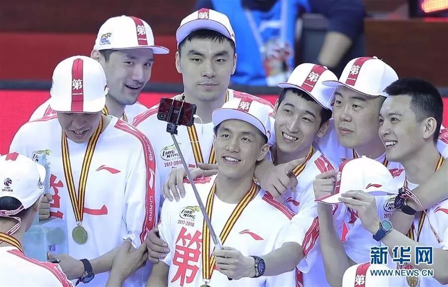 2018年4月22日,辽宁本钢队球员在颁奖仪式上庆祝夺得总冠军。新华社记者 王东震 摄