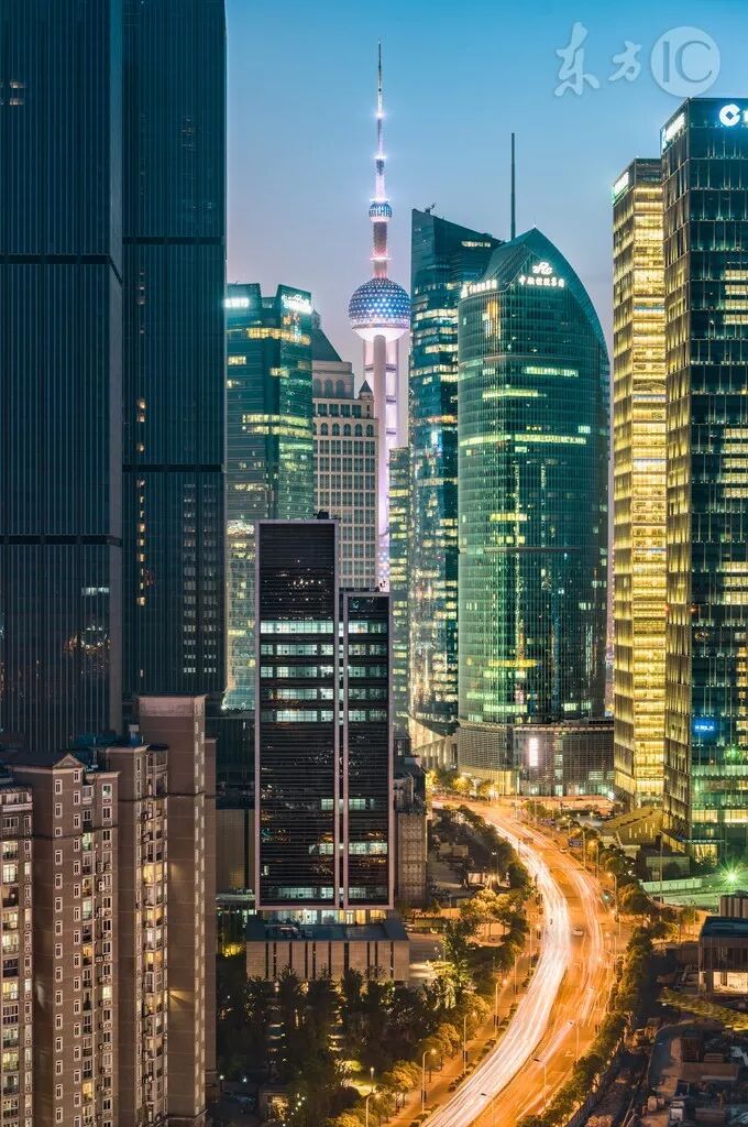 灯光璀璨,车灯组成的车流驶向东方明珠。