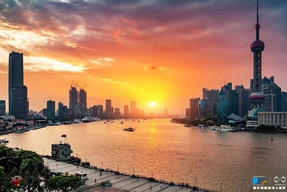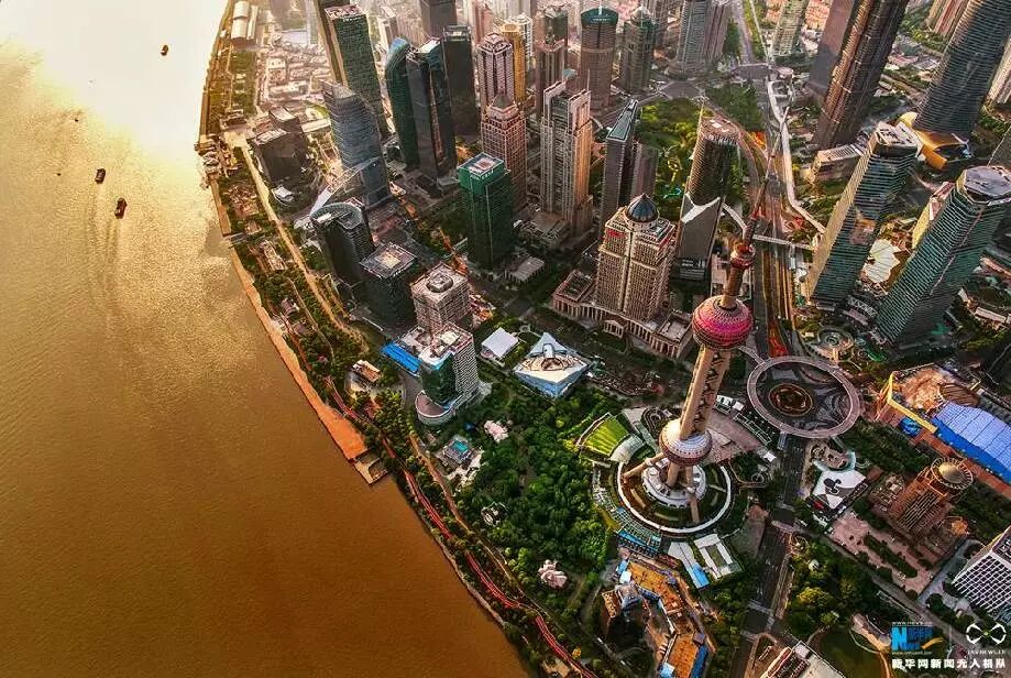 无人机航拍上海沿江美景,江水被镀上一层金黄。新华网发 王正坤 摄