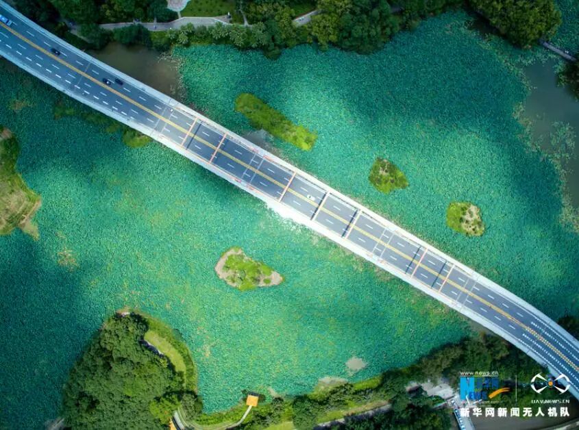 航拍深圳洪湖公园的湖中岛群,如镶嵌在“绿洲”上的明珠,别样美丽。新华网发(缪华 摄)